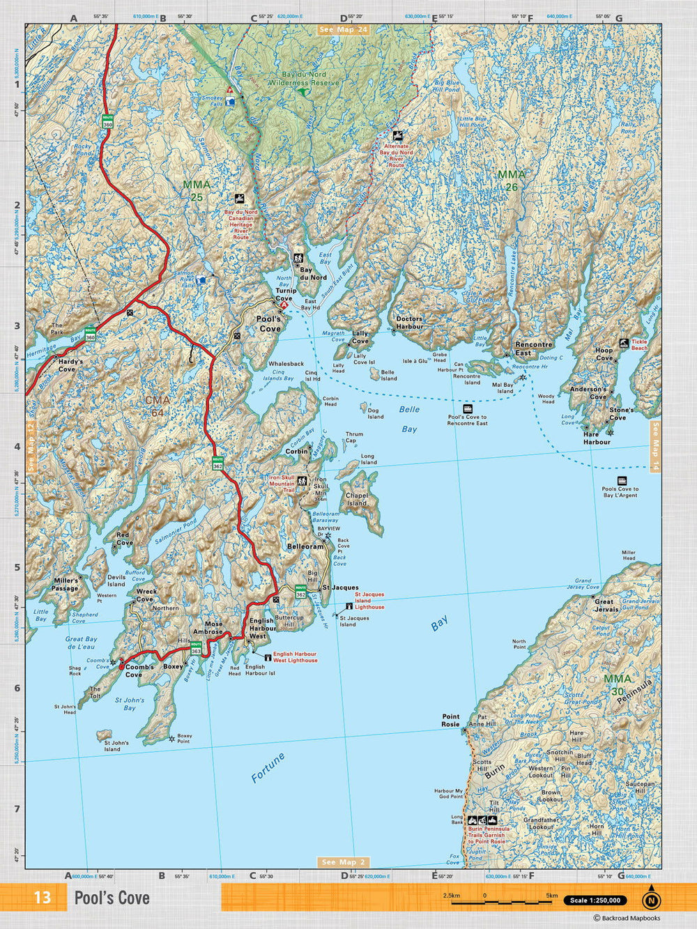 This recreation topographic map for Pool's Cove highlights all the logging/resource roads, hunting areas, fishing lakes & streams, campsites, paddling routes for canoeing and kayaking, wildlife viewing areas, multi-use trails for hiking, biking, horseback riding, cross-country skiing and snowshoeing, motorized trails for ATVing and snowmobiling & more. Covering 3,040 km2 (1,170 mi2), this 1:85,000 scale map measures 48 x 63.5 km (30 x 39.5 mi), providing you with more topographic and recreational detail for the Fortune area than any other map on the market. Special features include countless roads, trails and recreational Points of Interest. Included on this map are Pool's Cove, Belle Bay, Fortune Bay, Bay du Nord Wilderness Reserve, Mal Bay, Bay du Nord River and more!