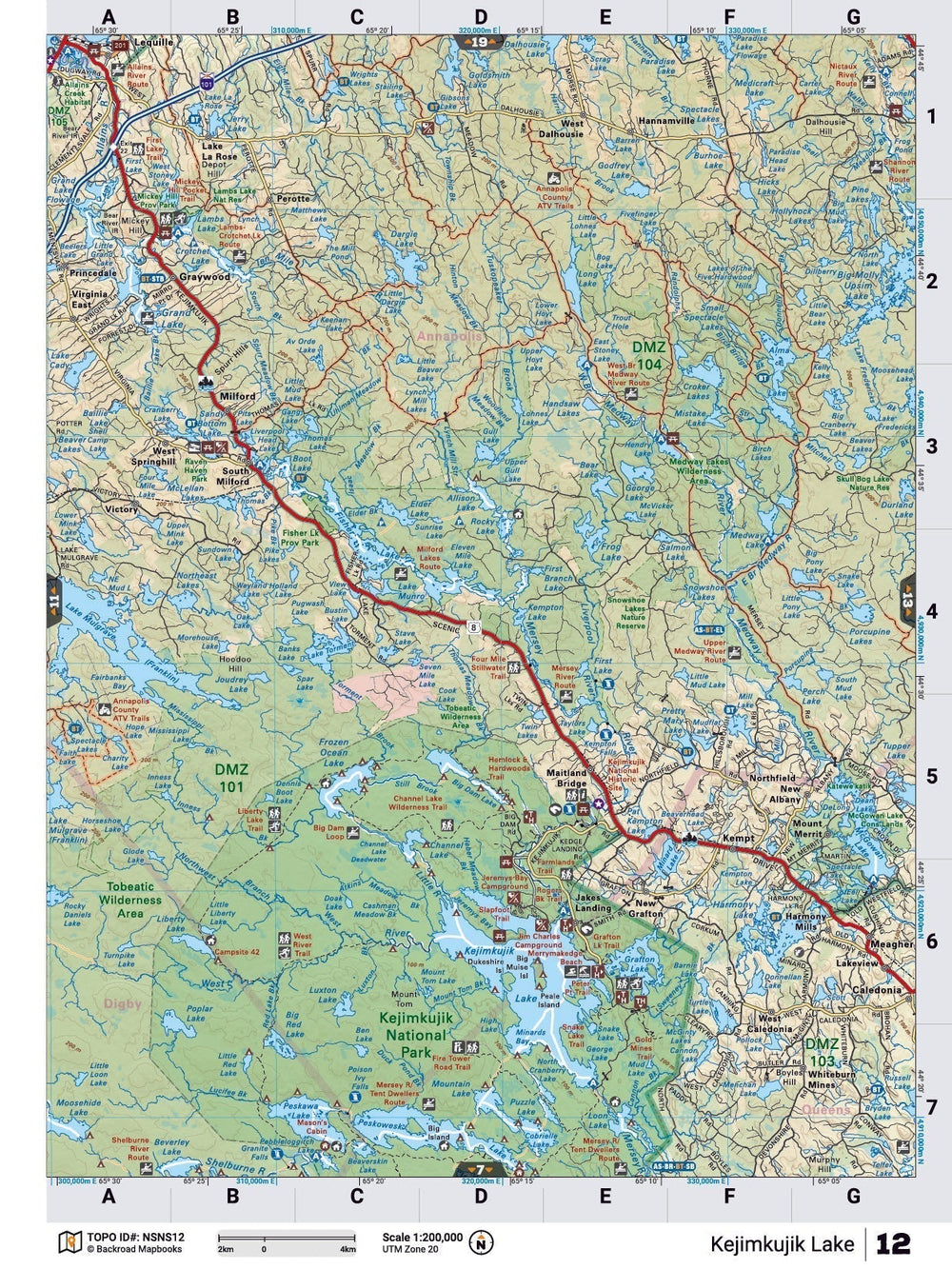 This recreation topographic map for Kejimkujik National Park highlights all the logging/resource roads, hunting areas, fishing lakes & streams, campsites, paddling routes for canoeing and kayaking, wildlife viewing areas, multi-use trails for hiking, biking, horseback riding, cross-country skiing and snowshoeing, motorized trails for ATVing and snowmobiling & more. Covering 1,925 km2 (745 mi2), this 1:65,000 scale map measures 38 x 50 km (24 x 31 mi), providing you with more topographic and recreational detail for the Yarmouth area than any other map on the market. Special features include the addition of Crown land areas and countless new roads, trails and recreational Points of Interest. Included on this map are Kejimkujik National Park, Lequille, Kejimkujik Lake, Tobeatic Wilderness Area, Lake Mulgrave, Graywood, Peskowesk Lake, Peskawa Lake, Milford, Medway River and more!