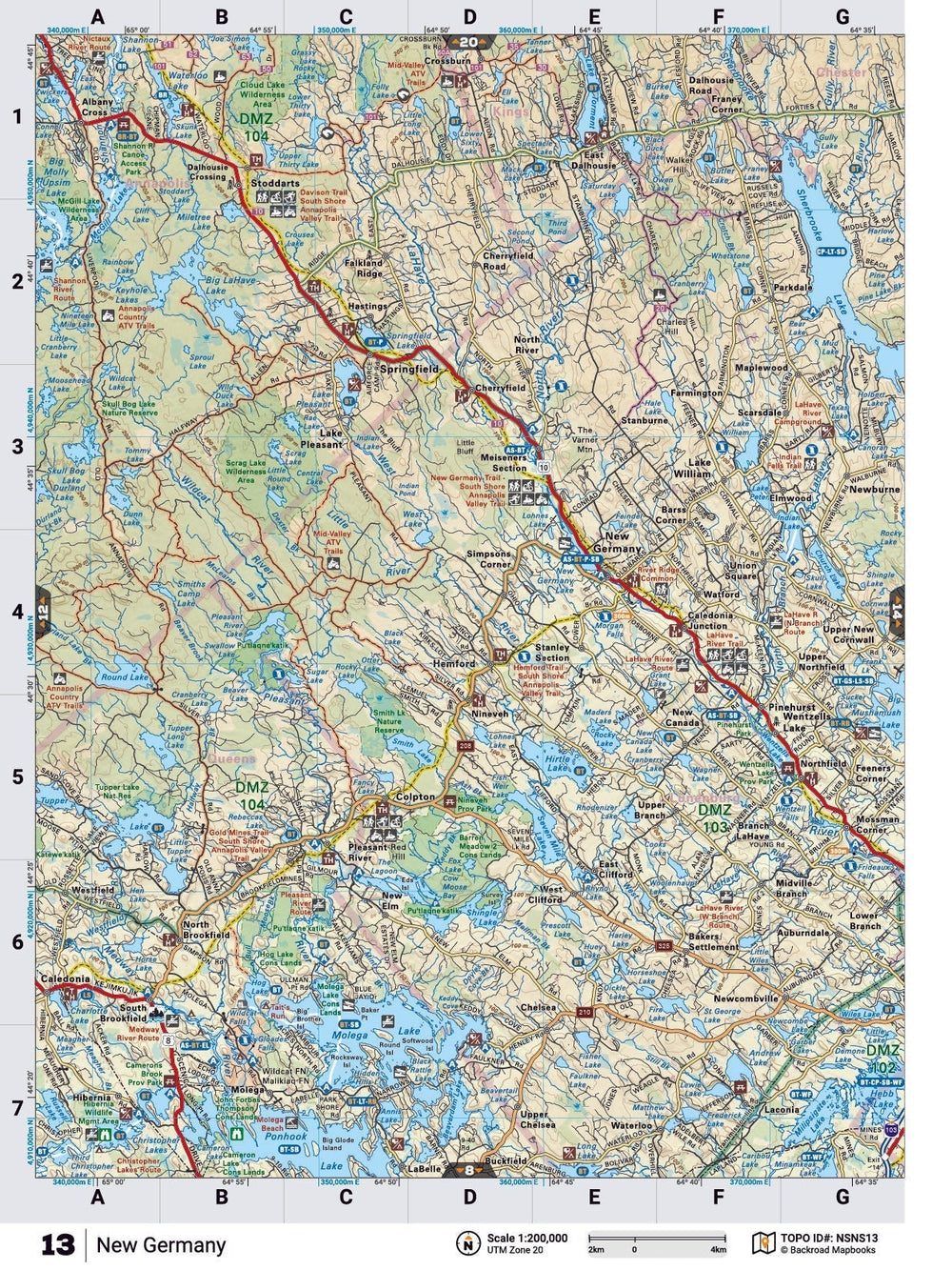 This recreation topographic map for New Germany highlights all the logging/resource roads, hunting areas, fishing lakes & streams, campsites, paddling routes for canoeing and kayaking, wildlife viewing areas, multi-use trails for hiking, biking, horseback riding, cross-country skiing and snowshoeing, motorized trails for ATVing and snowmobiling & more. Covering 1,925 km2 (745 mi2), this 1:65,000 scale map measures 38 x 50 km (24 x 31 mi), providing you with more topographic and recreational detail for the Yarmouth area than any other map on the market. Special features include the addition of Crown land areas and countless new roads, trails and recreational Points of Interest. Included on this map are Sherbrooke Lake, New Germany, Springfield, Molega Lake, Ponhook Lake, Lake Torment, Albany Cross, Crossburn, Wildcat River, Pleasant River and more!