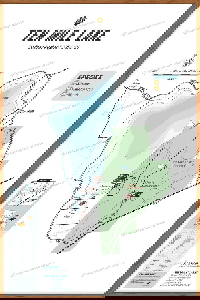 This Fishing Chart covers Ten Mile Lake on Cariboo Region, BC. Resting in BC Fishing Region 5, the map features the lake bathymetry (or lake depths) and shore features including boat launches, campsites, fishing docks, parks and resorts. In addition to road or trail access points, the map also includes the lake location and information such as elevation, surface area, mean and maximum depth, and waypoint. Additional features include the fish species found in the lake, an area indicator or map key, scale bar and map legend.