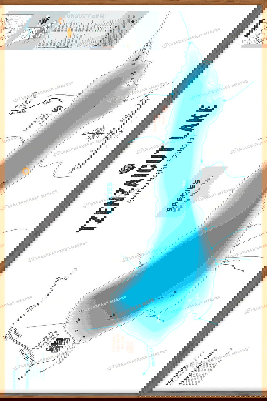 This Fishing Chart covers Tzenzaicut Lake on Cariboo Region, BC. Resting in BC Fishing Region 5, the map features the lake bathymetry (or lake depths) and shore features including boat launches, campsites, fishing docks, parks and resorts. In addition to road or trail access points, the map also includes the lake location and information such as elevation, surface area, mean and maximum depth, and waypoint. Additional features include the fish species found in the lake, an area indicator or map key, scale bar and map legend.