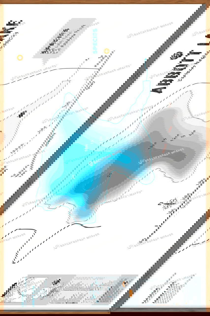 This Fishing Chart covers Abbott Lake on Cariboo Region, BC. Resting in BC Fishing Region 5, the map features the lake bathymetry (or lake depths) and shore features including boat launches, campsites, fishing docks, parks and resorts. In addition to road or trail access points, the map also includes the lake location and information such as elevation, surface area, mean and maximum depth, and waypoint. Additional features include the fish species found in the lake, an area indicator or map key, scale bar and map legend.