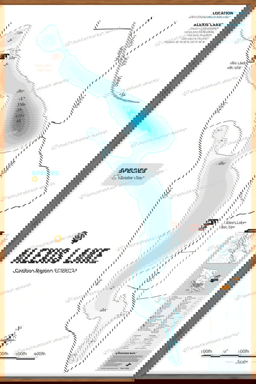 This Fishing Chart covers Alexis Lake on Cariboo Region, BC. Resting in BC Fishing Region 5, the map features the lake bathymetry (or lake depths) and shore features including boat launches, campsites, fishing docks, parks and resorts. In addition to road or trail access points, the map also includes the lake location and information such as elevation, surface area, mean and maximum depth, and waypoint. Additional features include the fish species found in the lake, an area indicator or map key, scale bar and map legend.