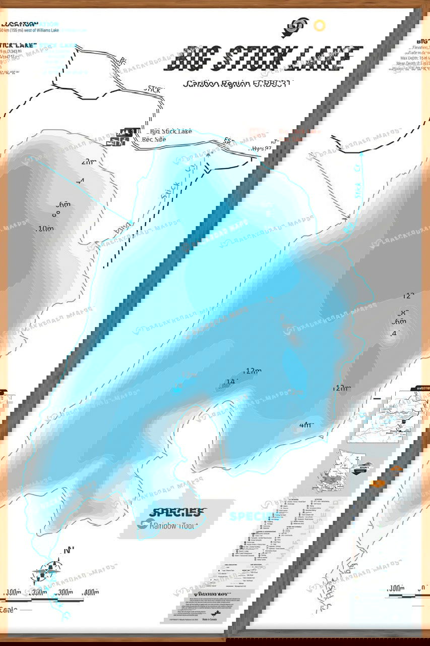 This Fishing Chart covers Big Stick Lake on Cariboo Region, BC. Resting in BC Fishing Region 5, the map features the lake bathymetry (or lake depths) and shore features including boat launches, campsites, fishing docks, parks and resorts. In addition to road or trail access points, the map also includes the lake location and information such as elevation, surface area, mean and maximum depth, and waypoint. Additional features include the fish species found in the lake, an area indicator or map key, scale bar and map legend.