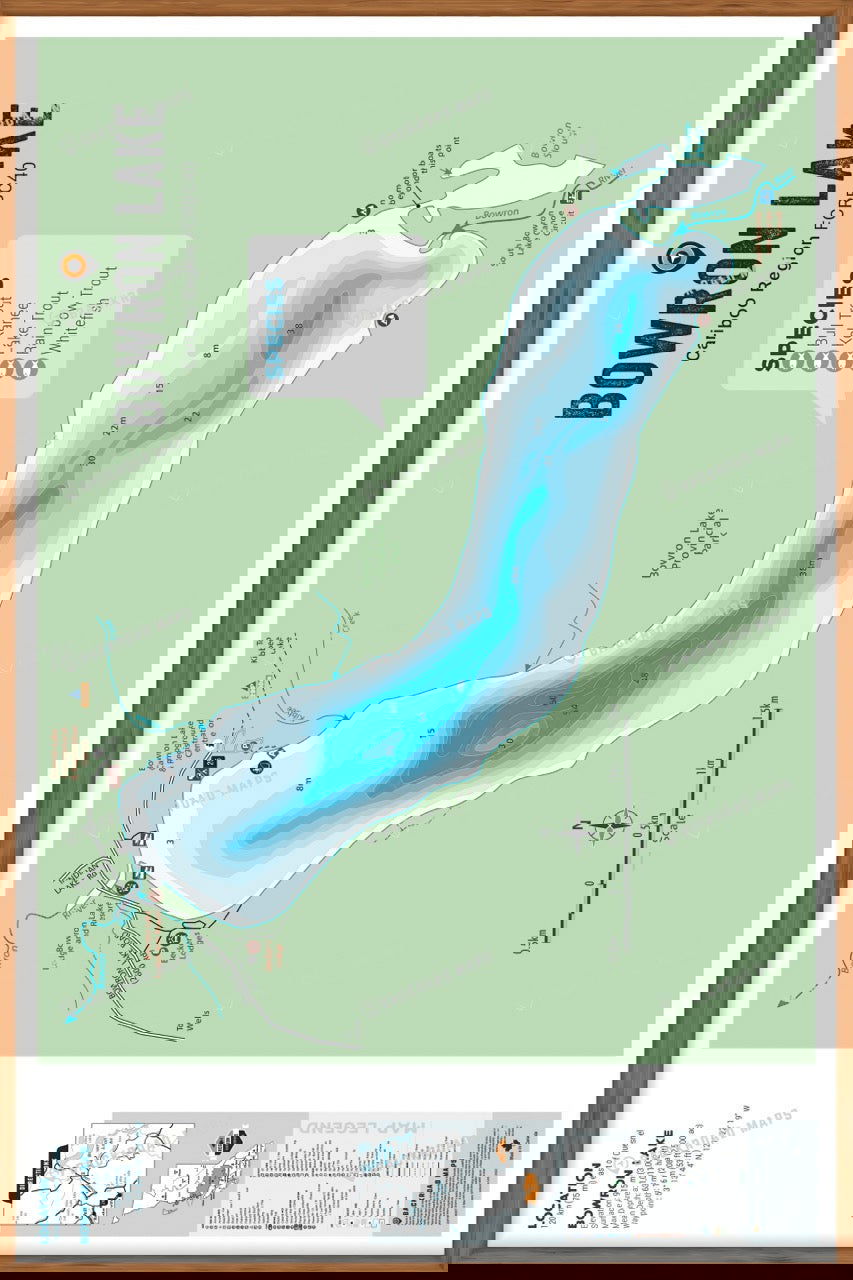 This Fishing Chart covers Bowron Lake on Cariboo Region, BC. Resting in BC Fishing Region 5, the map features the lake bathymetry (or lake depths) and shore features including boat launches, campsites, fishing docks, parks and resorts. In addition to road or trail access points, the map also includes the lake location and information such as elevation, surface area, mean and maximum depth, and waypoint. Additional features include the fish species found in the lake, an area indicator or map key, scale bar and map legend.