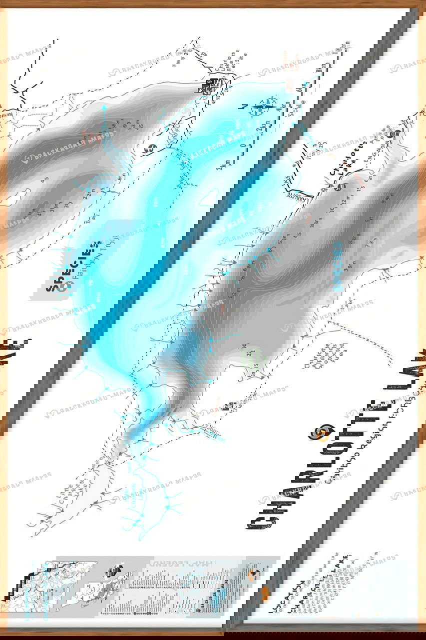 This Fishing Chart covers Charlotte Lake on Cariboo Region, BC. Resting in BC Fishing Region 5, the map features the lake bathymetry (or lake depths) and shore features including boat launches, campsites, fishing docks, parks and resorts. In addition to road or trail access points, the map also includes the lake location and information such as elevation, surface area, mean and maximum depth, and waypoint. Additional features include the fish species found in the lake, an area indicator or map key, scale bar and map legend.