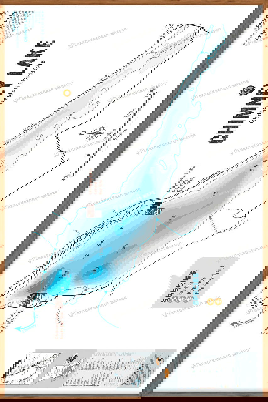 This Fishing Chart covers Chimney Lake on Cariboo Region, BC. Resting in BC Fishing Region 5, the map features the lake bathymetry (or lake depths) and shore features including boat launches, campsites, fishing docks, parks and resorts. In addition to road or trail access points, the map also includes the lake location and information such as elevation, surface area, mean and maximum depth, and waypoint. Additional features include the fish species found in the lake, an area indicator or map key, scale bar and map legend.