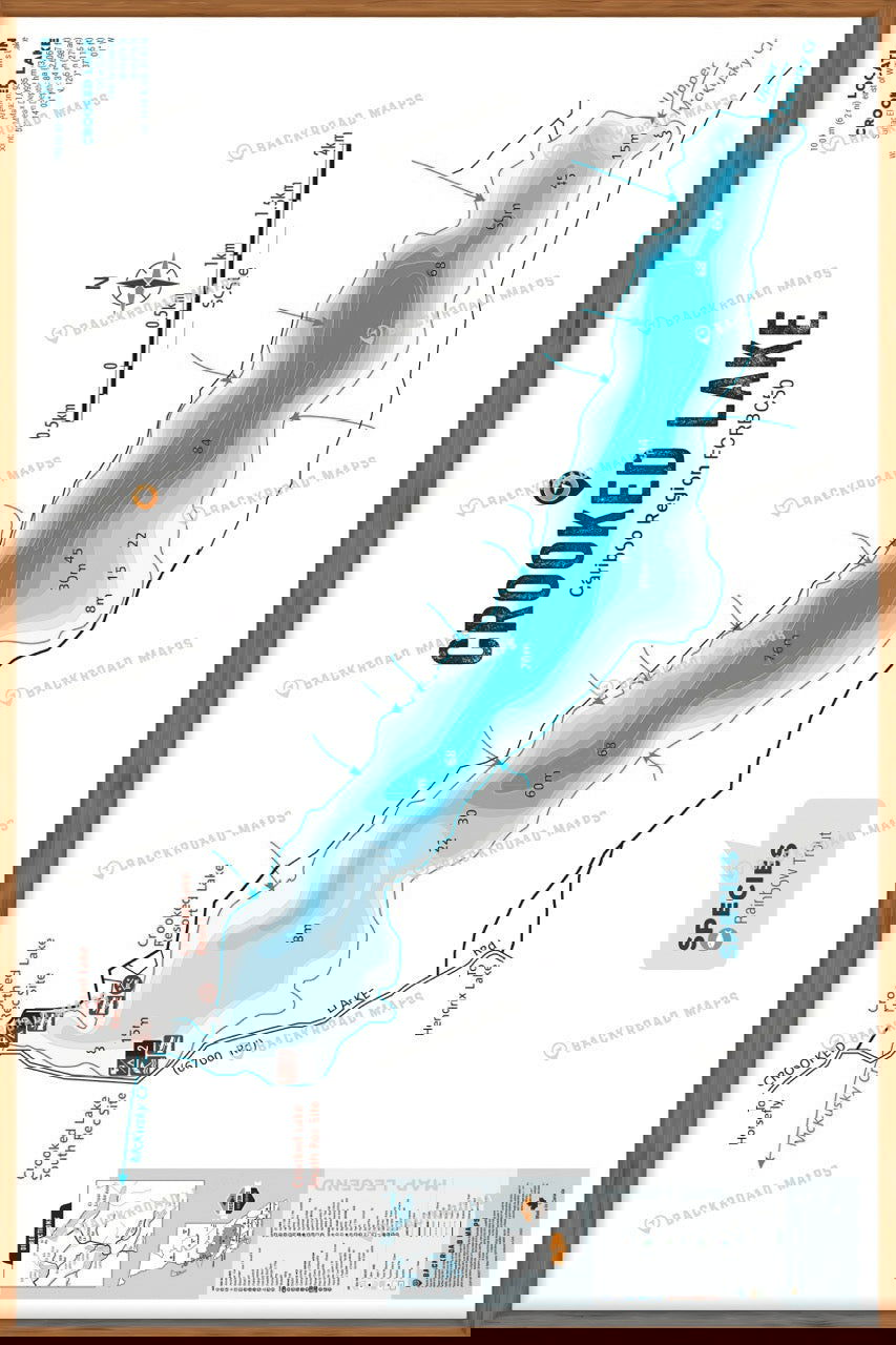 This Fishing Chart covers Crooked Lake on Cariboo Region, BC. Resting in BC Fishing Region 5, the map features the lake bathymetry (or lake depths) and shore features including boat launches, campsites, fishing docks, parks and resorts. In addition to road or trail access points, the map also includes the lake location and information such as elevation, surface area, mean and maximum depth, and waypoint. Additional features include the fish species found in the lake, an area indicator or map key, scale bar and map legend.