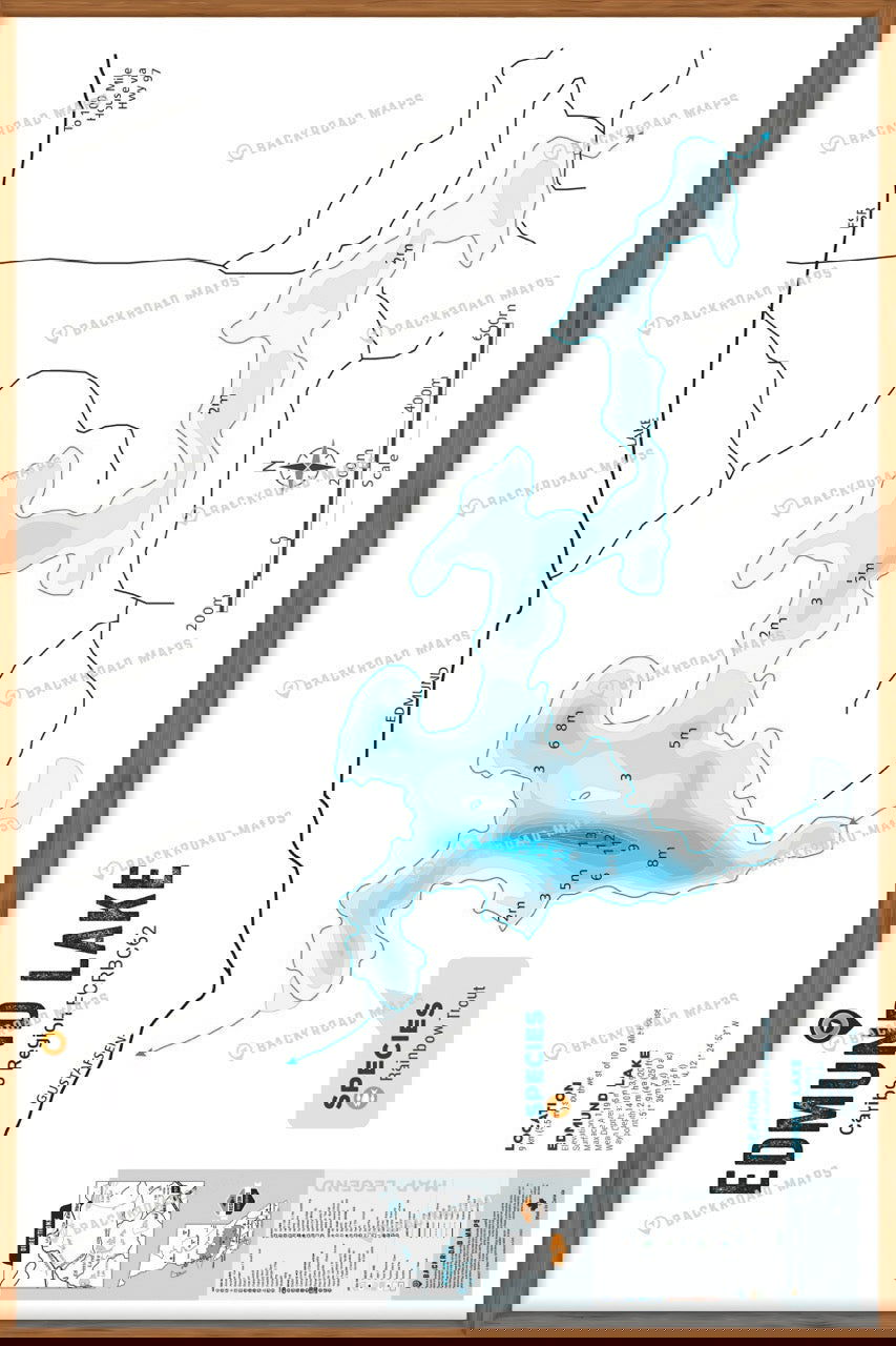 This Fishing Chart covers Edmund Lake on Cariboo Region, BC. Resting in BC Fishing Region 5, the map features the lake bathymetry (or lake depths) and shore features including boat launches, campsites, fishing docks, parks and resorts. In addition to road or trail access points, the map also includes the lake location and information such as elevation, surface area, mean and maximum depth, and waypoint. Additional features include the fish species found in the lake, an area indicator or map key, scale bar and map legend.