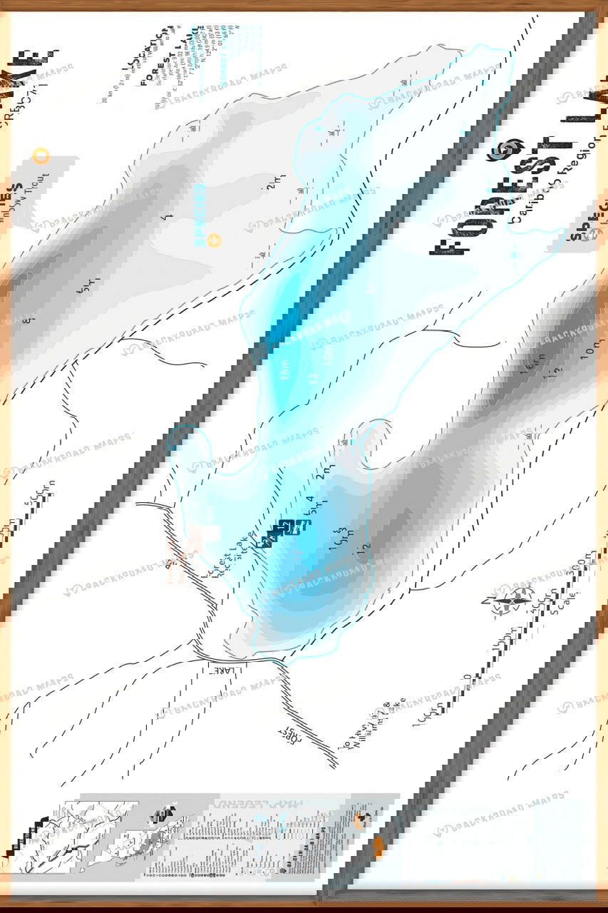 This Fishing Chart covers Forest Lake on Cariboo Region, BC. Resting in BC Fishing Region 5, the map features the lake bathymetry (or lake depths) and shore features including boat launches, campsites, fishing docks, parks and resorts. In addition to road or trail access points, the map also includes the lake location and information such as elevation, surface area, mean and maximum depth, and waypoint. Additional features include the fish species found in the lake, an area indicator or map key, scale bar and map legend.