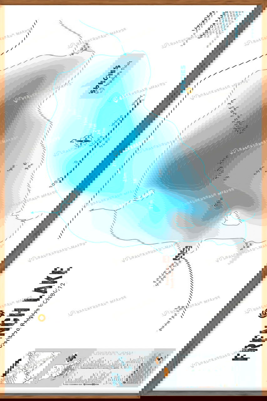 This Fishing Chart covers French Lake on Cariboo Region, BC. Resting in BC Fishing Region 5, the map features the lake bathymetry (or lake depths) and shore features including boat launches, campsites, fishing docks, parks and resorts. In addition to road or trail access points, the map also includes the lake location and information such as elevation, surface area, mean and maximum depth, and waypoint. Additional features include the fish species found in the lake, an area indicator or map key, scale bar and map legend.