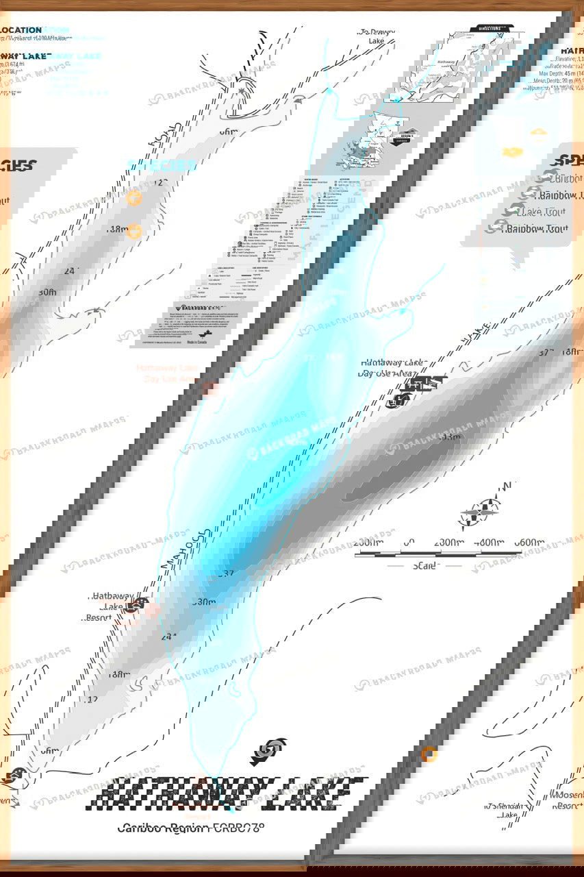 This Fishing Chart covers Hathaway Lake on Cariboo Region, BC. Resting in BC Fishing Region 5, the map features the lake bathymetry (or lake depths) and shore features including boat launches, campsites, fishing docks, parks and resorts. In addition to road or trail access points, the map also includes the lake location and information such as elevation, surface area, mean and maximum depth, and waypoint. Additional features include the fish species found in the lake, an area indicator or map key, scale bar and map legend.
