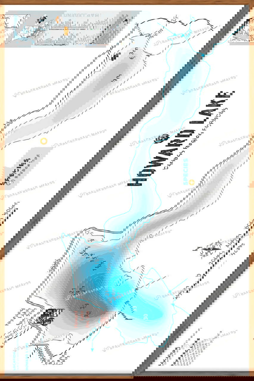 This Fishing Chart covers Howard Lake on Cariboo Region, BC. Resting in BC Fishing Region 5, the map features the lake bathymetry (or lake depths) and shore features including boat launches, campsites, fishing docks, parks and resorts. In addition to road or trail access points, the map also includes the lake location and information such as elevation, surface area, mean and maximum depth, and waypoint. Additional features include the fish species found in the lake, an area indicator or map key, scale bar and map legend.