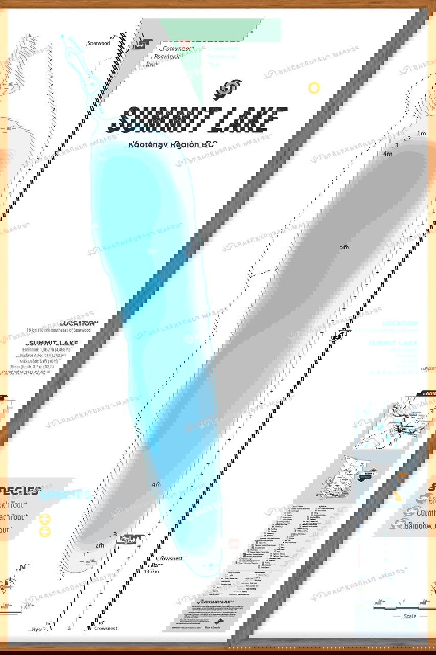 This Fishing Chart covers Summit Lake - Sparwood/Crowsnest Pass on Kootenay Rockies, BC. Resting in BC Fishing Region 4, the map features the lake bathymetry (or lake depths) and shore features including boat launches, campsites, fishing docks, parks and resorts. In addition to road or trail access points, the map also includes the lake location and information such as elevation, surface area, mean and maximum depth, and waypoint. Additional features include the fish species found in the lake, an area indicator or map key, scale bar and map legend.