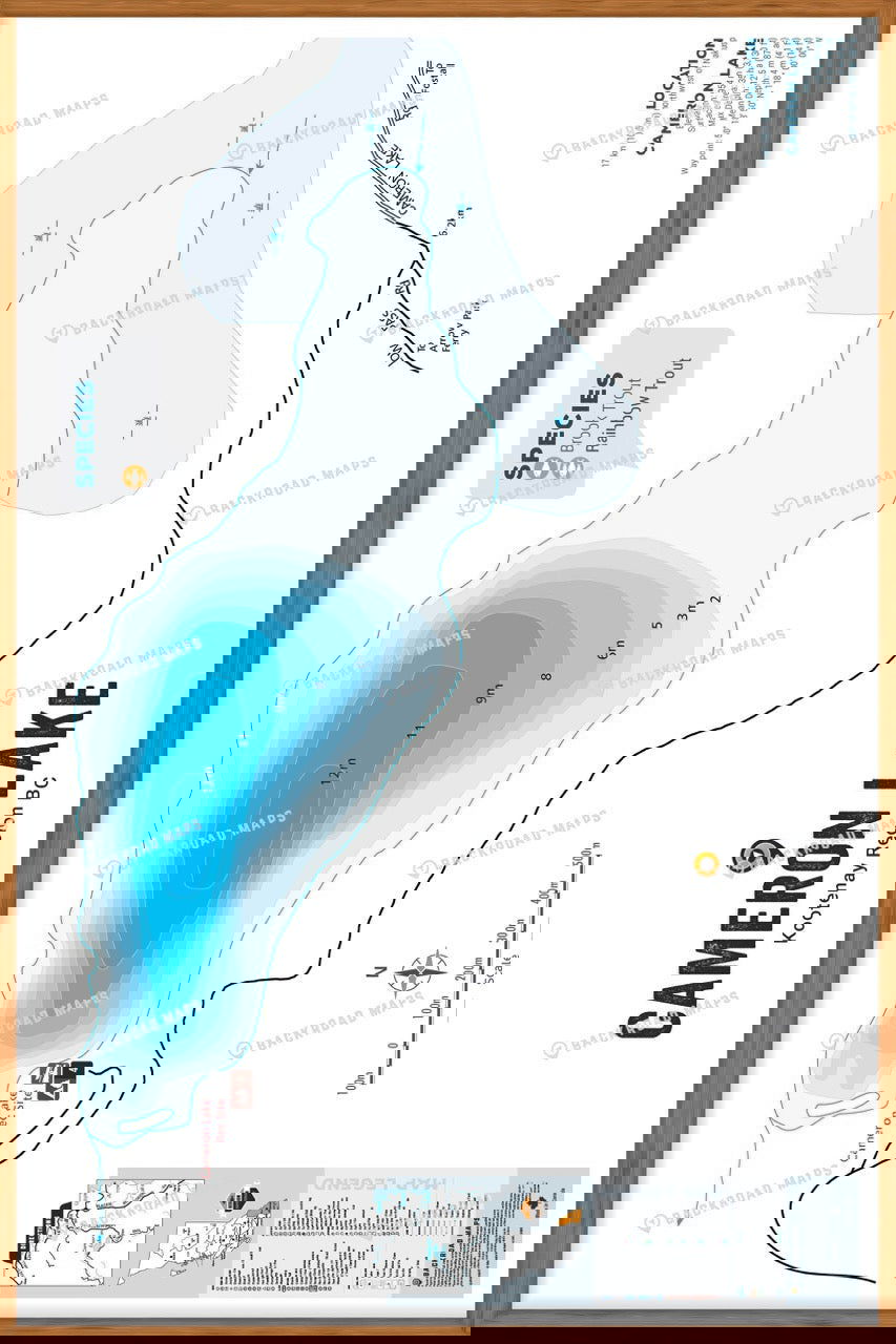This Fishing Chart covers Cameron Lake on Kootenay Rockies, BC. Resting in BC Fishing Region 4, the map features the lake bathymetry (or lake depths) and shore features including boat launches, campsites, fishing docks, parks and resorts. In addition to road or trail access points, the map also includes the lake location and information such as elevation, surface area, mean and maximum depth, and waypoint. Additional features include the fish species found in the lake, an area indicator or map key, scale bar and map legend.