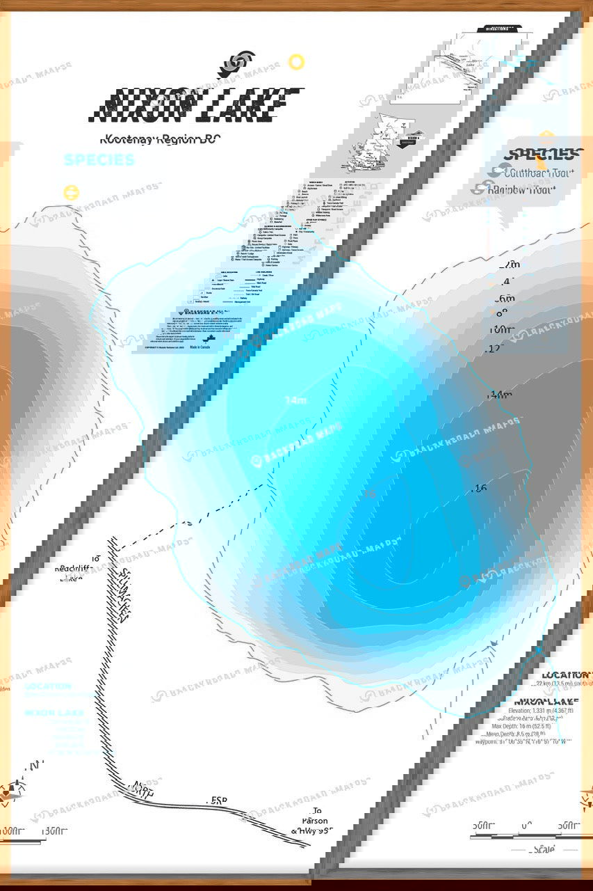 This Fishing Chart covers Nixon Lake on Kootenay Rockies, BC. Resting in BC Fishing Region 4, the map features the lake bathymetry (or lake depths) and shore features including boat launches, campsites, fishing docks, parks and resorts. In addition to road or trail access points, the map also includes the lake location and information such as elevation, surface area, mean and maximum depth, and waypoint. Additional features include the fish species found in the lake, an area indicator or map key, scale bar and map legend.