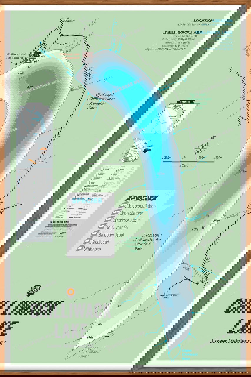 This Fishing Chart covers Chilliwack Lake on Lower Mainland, BC. Resting in BC Fishing Region 2, the map features the lake bathymetry (or lake depths) and shore features including boat launches, campsites, fishing docks, parks and resorts. In addition to road or trail access points, the map also includes the lake location and information such as elevation, surface area, mean and maximum depth, and waypoint. Additional features include the fish species found in the lake, an area indicator or map key, scale bar and map legend.