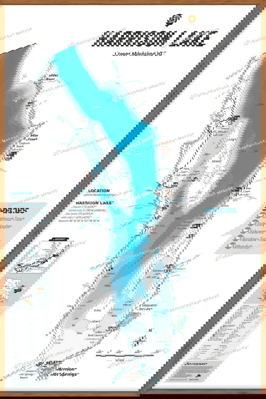 This Fishing Chart covers Harrison Lake on Lower Mainland, BC. Resting in BC Fishing Region 2, the map features the lake bathymetry (or lake depths) and shore features including boat launches, campsites, fishing docks, parks and resorts. In addition to road or trail access points, the map also includes the lake location and information such as elevation, surface area, mean and maximum depth, and waypoint. Additional features include the fish species found in the lake, an area indicator or map key, scale bar and map legend.