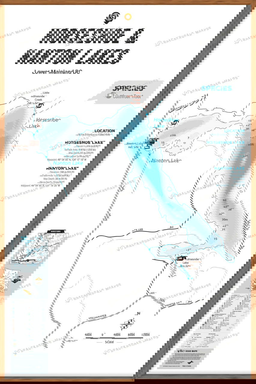 This Fishing Chart covers Horseshoe & Nanton Lakes on Lower Mainland, BC. Resting in BC Fishing Region 2, the map features the lake bathymetry (or lake depths) and shore features including boat launches, campsites, fishing docks, parks and resorts. In addition to road or trail access points, the map also includes the lake location and information such as elevation, surface area, mean and maximum depth, and waypoint. Additional features include the fish species found in the lake, an area indicator or map key, scale bar and map legend.