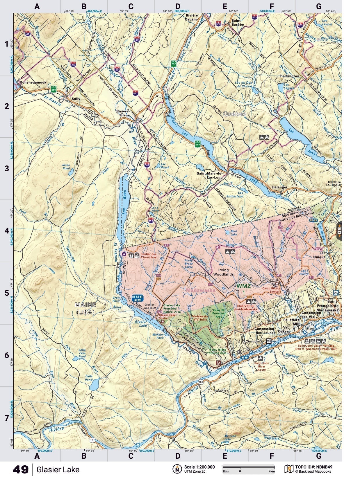 This recreation topographic map for Glasier Lake highlights all the logging/resource roads, hunting areas, fishing lakes & streams, campsites, paddling routes for canoeing and kayaking, wildlife viewing areas, multi-use trails for hiking, biking, horseback riding, cross-country skiing and snowshoeing, motorized trails for ATVing and snowmobiling & more. Covering 1,950 km2 (750 mi2), this 1:65,000 scale map measures 38 x 51 km (23.5 x 32 mi), providing you with more topographic and recreational detail for the Grand Manan Island area than any other map on the market. New features include enhanced Crown land data and countless updates to roads, trails and recreational Points of Interest. This map includes Saint John River, Lac Long, Lac Jerry, Lac Unique, Saint Francois de Madawaska, Concession des Viel, Pelletiers Mill, Val Oakes, Concession des Jaunes, Connors, Glasier Lake and more! This map also covers the following Wildlife Management Units: WMZ 1. Glasier Lake - New Brunswick comes printed on waterproof synthetic material for extra durability.