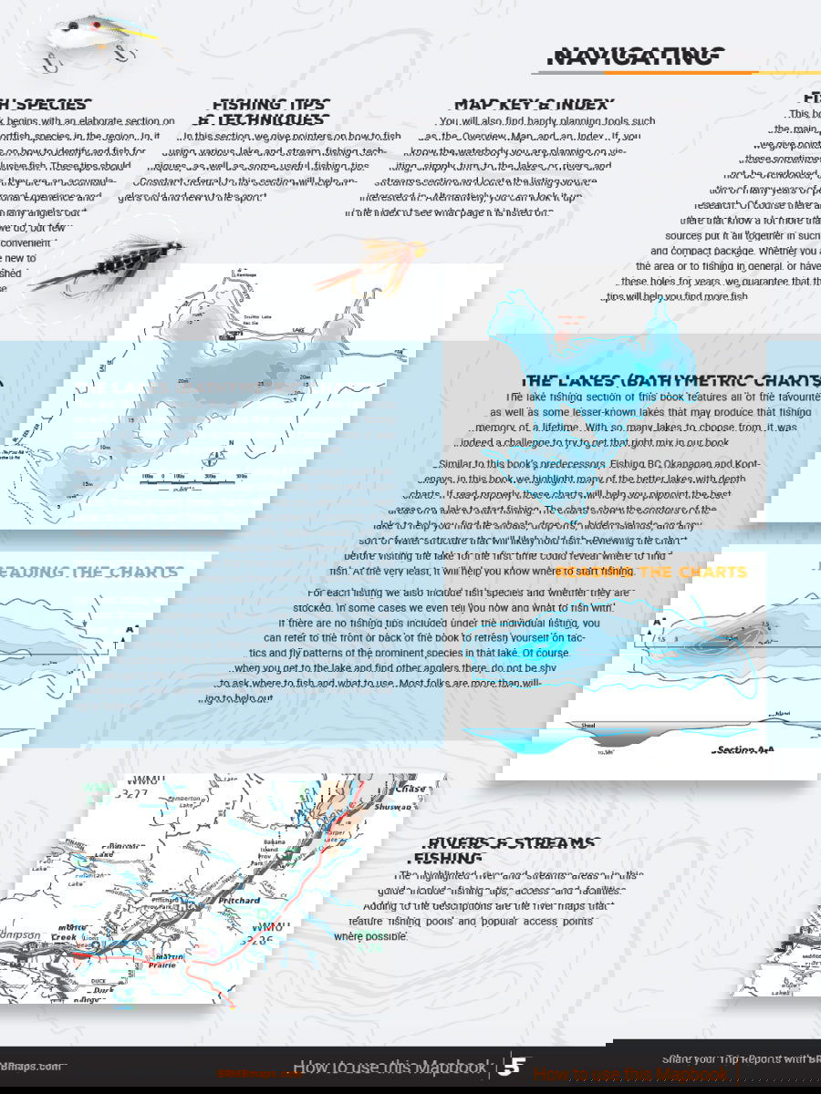 The printed version of this fishing mapbook comes in the convenient 21.5 x 28 cm (8.5 x 11 inch) mapbook format with a heavy-duty spiral-bound cover. Containing Region 3 (Thompson/Nicola) and Region 8 (Okanagan), the 224 page book includes over 210 lakes and rivers and shows you where to fish and how to best fish any given area. We have loaded it with fishing tips, breakdowns of various fish species, fly hatches and specific information on each lake and stream. Inside, you will find maps and depth charts for popular lakes, plus bar or hot spot maps of the main rivers in this region. Nowhere else will you find this combination of detailed regional information plus angling expertise all in one place.