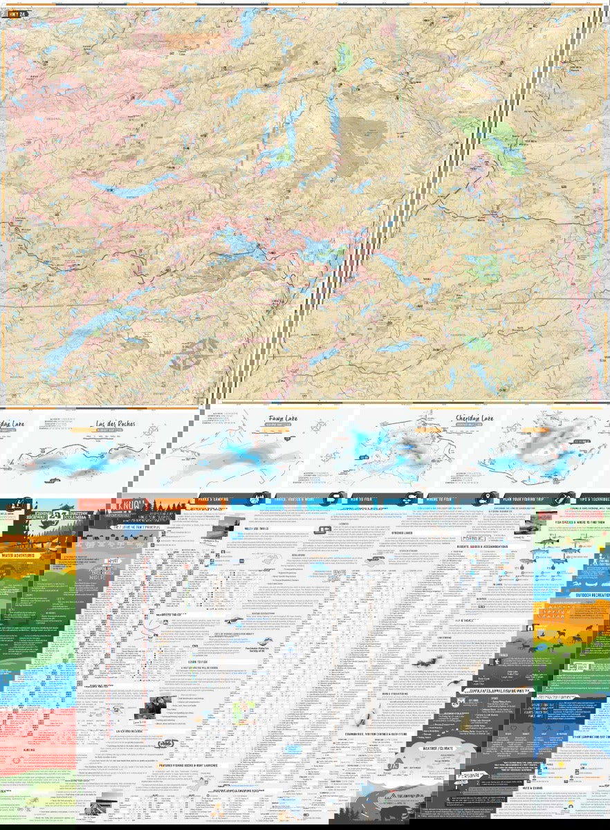 Located within the stunning Cariboo Chilcotin Coast & Thompson Okanagan regions of British Columbia, the Land of Hidden Waters and BC Fishing Highway 24 corridor features some of the most well-known and best fishing lakes in the province. Highlighting lakes such as Adams Lake, Fawn Lake, Sheridan Lake, Barriere Lakes, Bridge Lake, Canim Lake, Green Lake, and Lac des Roches, and featuring regions from Kamloops to Clearwater, Logan Lake to Lac La Hache and 100 Mile House to Little Fort and surrounding areas including Wells Gray Provincial Park, this map is the perfect planning tool for anglers and outdoor enthusiasts of all skill levels. Whether you are looking for new local lakes to fish and explore or planning a multi-day road trip to this fantastic region, this map gives you the most comprehensive coverage available.