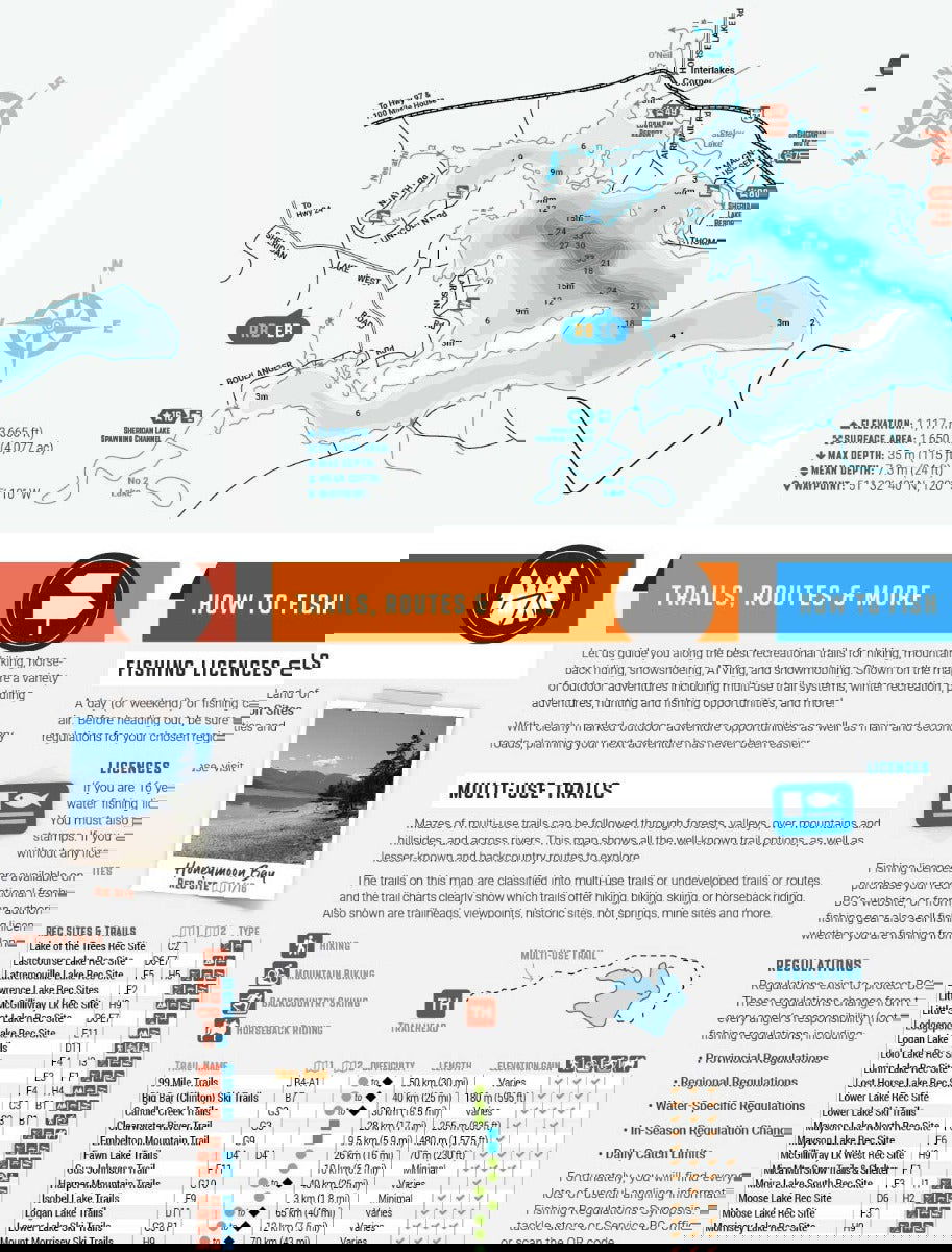 This special edition recreation map features an overview map of the Land of Hidden Waters on one side, with a zoomed-in map of the famed BC Fishing Highway 24 on the other side. In addition to these two comprehensive maps, we have included several trip planning sections: