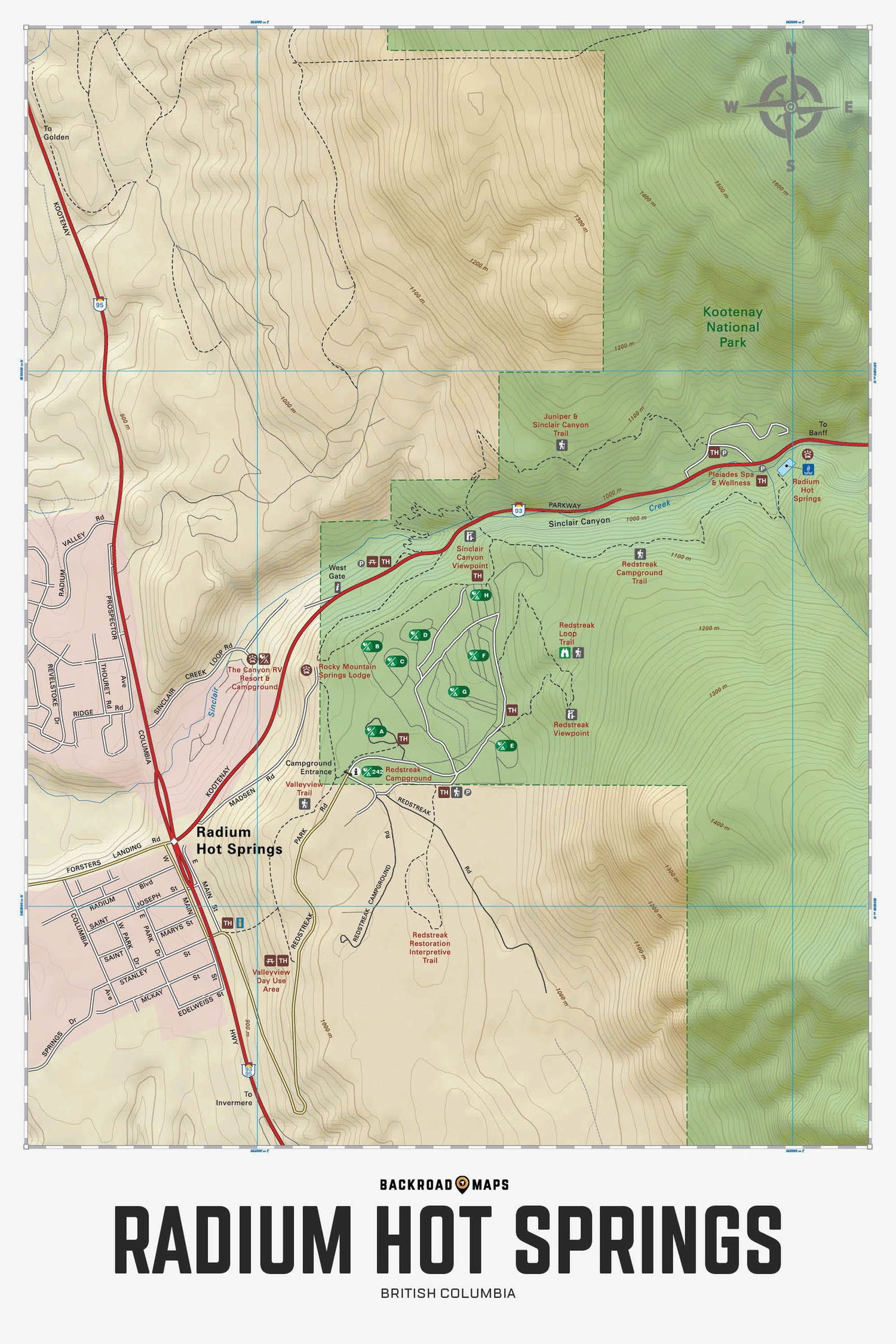Focusing on the Radium Hot Springs and Redstreak Campground area of Kootenay National Park in BC, this BRMB Adventure topographic map highlights all the roadways, hiking and biking trails, campgrounds, access roads, interpretive trails, picnic areas, viewpoints and more! Shown at 1:5,500 scale, this map features our industry-leading topographic contours and relief shading. Included on the map are Highway 93, Highway 95, Radium Hot Springs, Redstreak Campground, Sinclair Canyon, Valley View Picnic Area, West Gate and more!