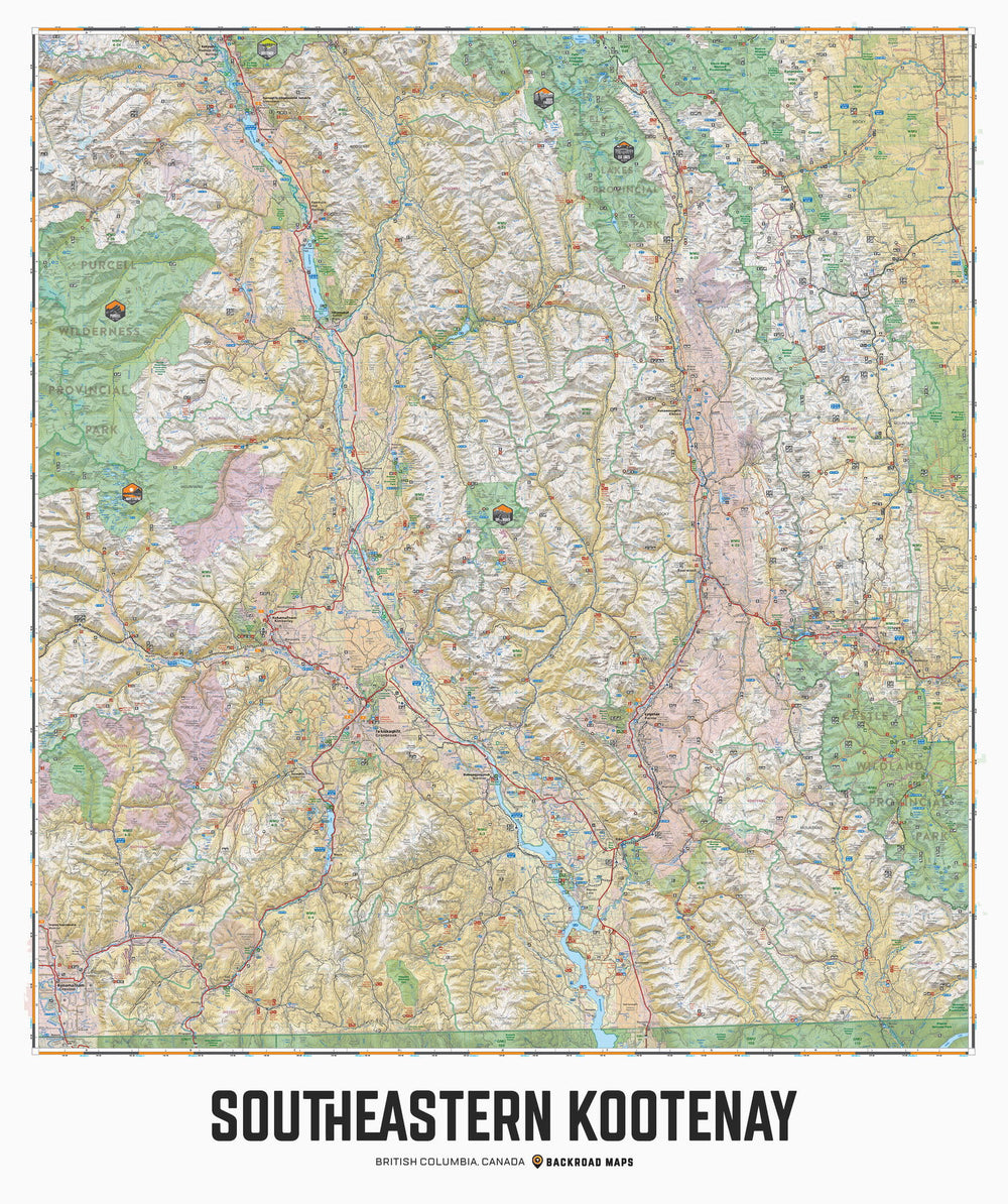 This recreation topographic map for Southeastern Kootenay BC highlights all the roads, fishing lakes & streams, front and backcountry campsites, paddling routes for canoeing and kayaking, wildlife viewing areas, multi-use trails for hiking, backcountry skiing, snowshoeing, mountain biking, horseback riding & more. Using 1:50,000 scale water and road data, this map is available in various wall map sizes, providing you with more topographic and recreational detail for the area than any other map on the market. Special features include private land and countless roads, trails and recreational Points of Interest. Included on this map are Cranbrook, Sparwood, Kimberley, Canal Flats, Elkford, Invermere, Fairmont Hot Springs, and more!