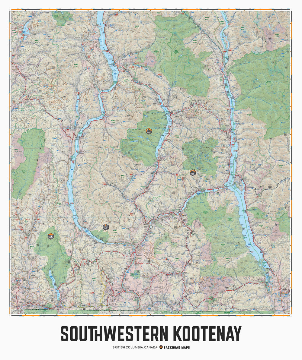 This recreation topographic map for Southwestern Kootenay BC highlights all the roads, fishing lakes & streams, front and backcountry campsites, paddling routes for canoeing and kayaking, wildlife viewing areas, multi-use trails for hiking, backcountry skiing, snowshoeing, mountain biking, horseback riding & more. Using 1:50,000 scale water and road data, this map is available in various wall map sizes, providing you with more topographic and recreational detail for the area than any other map on the market. Special features include private land and countless roads, trails and recreational Points of Interest.