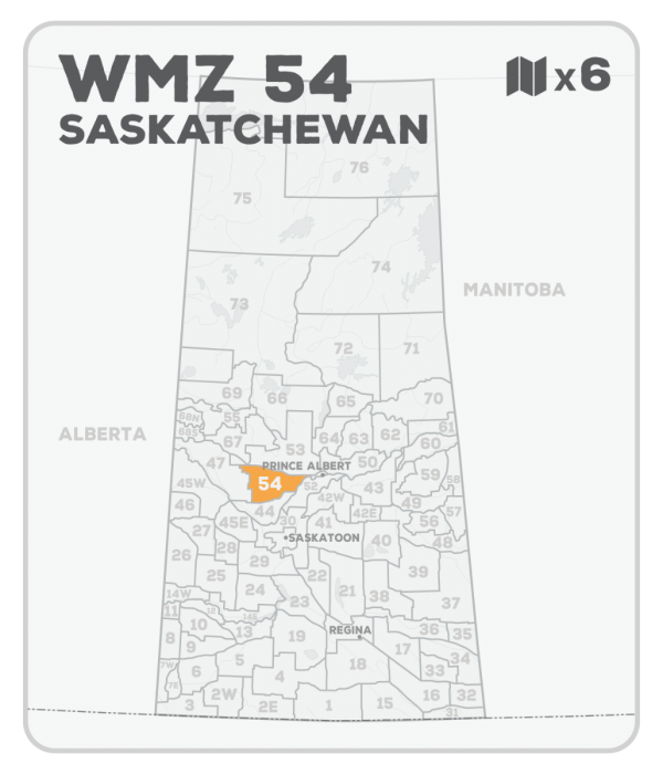 This hunting map bundle includes six individual topographic maps covering this zone. Printed at a 1:100,000 scale, these maps feature clearly marked Wildlife Management Zones, along with fish and wildlife areas and township and range road systems. Updated road and trail systems, recreational points of interest, campsites and more make these the most detailed hunting maps available on the market. WMZ 54 is located west of Prince Albert with Highway 3 in the north, the North Saskatchewan River and Highways 40 & 783 in the south and a combination of Highways 376, 324, 378 & 794 in the west acting as boundaries.