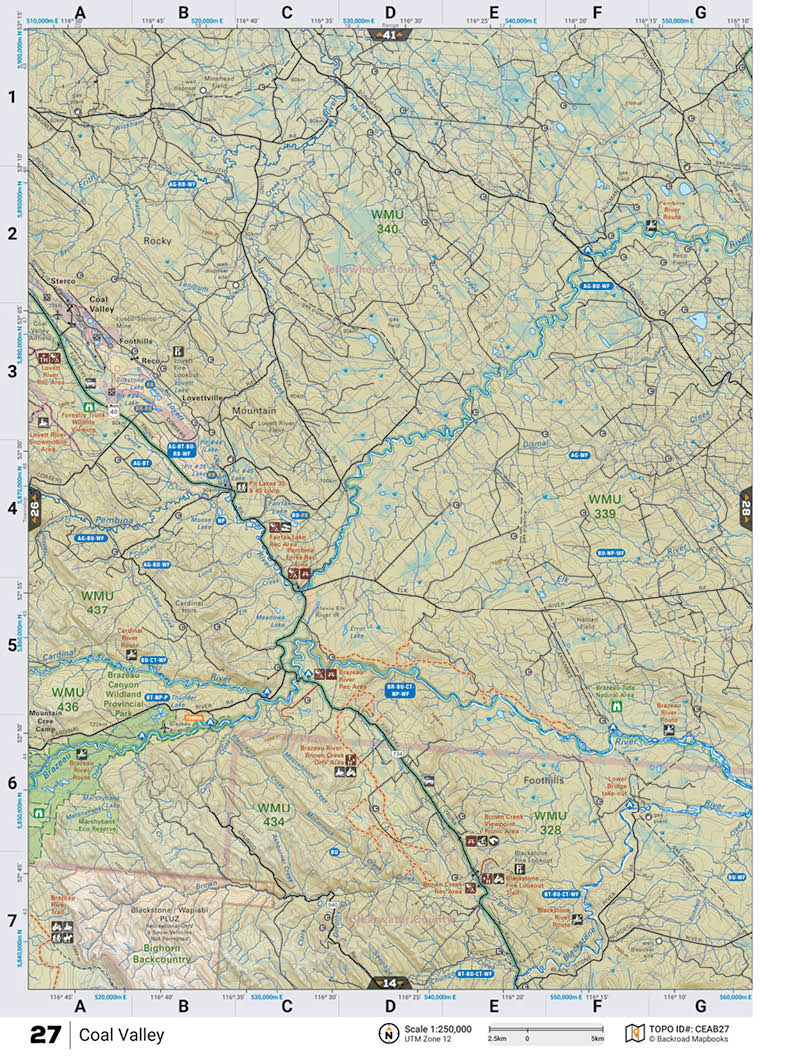 This recreation topographic map for Coal Valley highlights all the logging and resource roads, multi-use trails for hikers, mountain bikers, horseback riders, cross-country skiers and snowshoers, motorized trails for ATVers and snowmobiles, fishing lakes and rivers, recreation areas, campgrounds, day-use areas, viewpoints, backcountry campsites, work camps, oil & gas sites,...