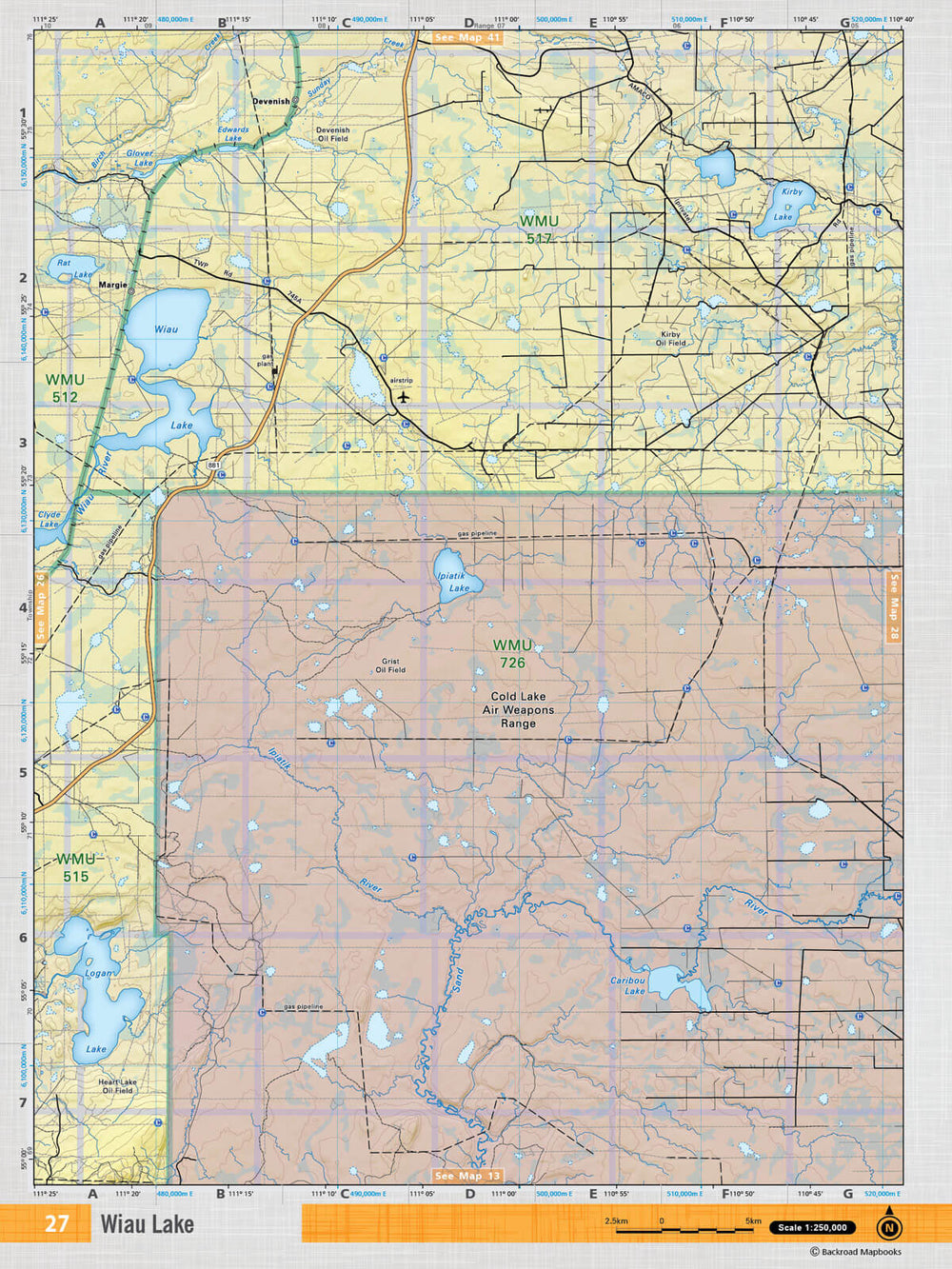 This recreation topographic map for the Wiau Lake area highlights all the logging and resource roads, multi-use trails for hikers, mountain bikers, horseback riders, cross-country skiers and snowshoers, motorized trails for ATVers and snowmobilers, fishing lakes and rivers, recreation areas, campgrounds, day-use areas, viewpoints, backcountry campsites, work camps, backcountry huts and cabins and more. No other map for the area provides you with this level of recreational or topographic detail. Special features include private land, labelled fish species and countless new roads, trails and recreational Points of Interest. This map also features enhanced oil & gas resource information, more detailed water features and seismic line corridors. Covering 1,268 km2 (490 mi2), this 1:85,000 scale map measures 96 x 127 km (59.5 x 79 mi). Included on the map are Wiau Lake, Logan Lake, Cold Lake Air Weapons Range, Caribou Lake, Sand River, Ipiatik Lake, Rat Lake, Kirby Lake, Devenish, Margie and more!