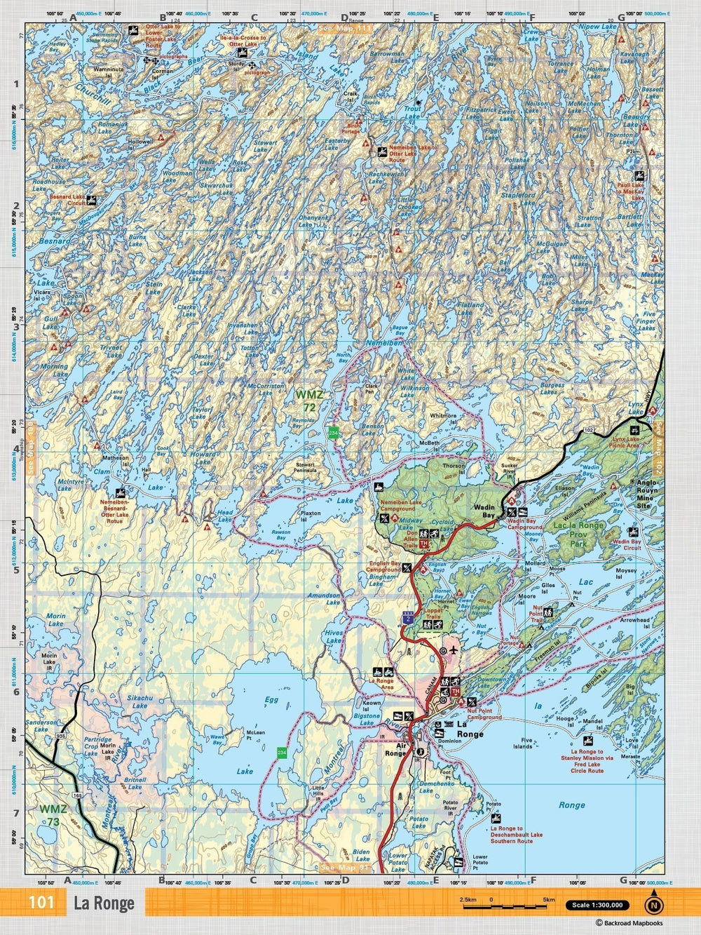 This recreation topographic map for the La Ronge area highlights all the logging and resource roads, multi-use trails for hikers, mountain bikers, horseback riders, cross-country skiers and snowshoers, motorized trails for ATVers and snowmobilers, fishing lakes and rivers, recreation areas, campgrounds, day-use areas, viewpoints, backcountry campsites, work camps, oil & gas sites and more. No other map for the area provides you with this level of recreational or topographic detail. Covering 4,450 km2 (1,620 mi2) in total, this 1:100,000 scale map measures 58 x 77 km (36 x 48 mi). Special features include the addition of Oil & Gas information including gas plants, disposal and compressor stations and updated seismic line corridors, the addition of Municipal Regional District Boundaries, new lake data and more. This map includes La Ronge, Besnard Lake, Churchill River, Nemeiben Lake, Clam Lake, Lac La Ronge Provincial Park, Lac La Ronge, Egg Lake, Montreal River and more!
