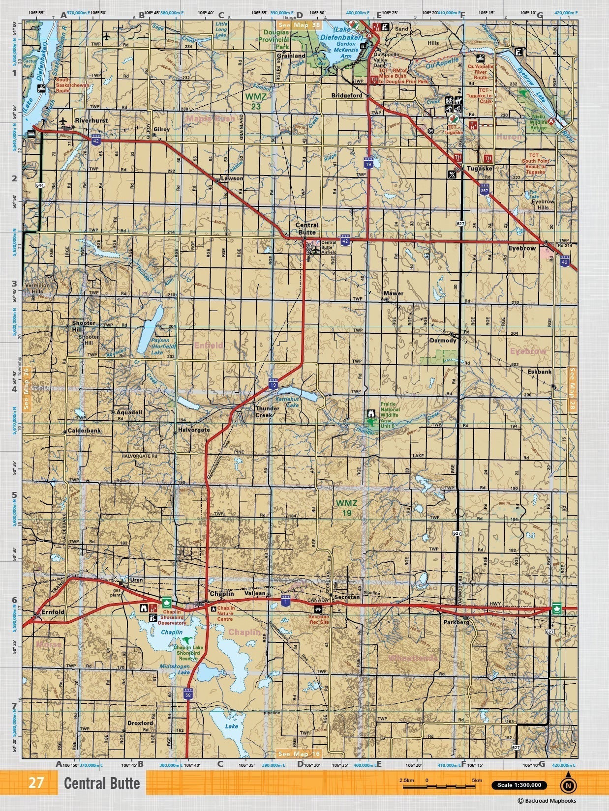This recreation topographic map for the Central Butte area highlights all the logging and resource roads, multi-use trails for hikers, mountain bikers, horseback riders, cross-country skiers and snowshoers, motorized trails for ATVers and snowmobilers, fishing lakes and rivers, recreation areas, campgrounds, day-use areas, viewpoints, backcountry campsites, work camps, oil & gas sites and more. No other map for the area provides you with this level of recreational or topographic detail. Covering 4,450 km2 (1,620 mi2) in total, this 1:100,000 scale map measures 58 x 77 km (36 x 48 mi). Special features include the addition of Oil & Gas information including gas plants, disposal and compressor stations and updated seismic line corridors, the addition of Municipal Regional District Boundaries, new lake data and more. This map includes Central Butte, Douglas Provincial Park, Eyebrow Lake, Chaplin Lake, Qu'Apelle River, Nisku Wildlife Range, Thunder Creek and more! This map also covers the following Wildlife Management Units: WMZ 71, WMZ 74. Central Butte - Saskatchewan comes in both Print and Digital Versions.