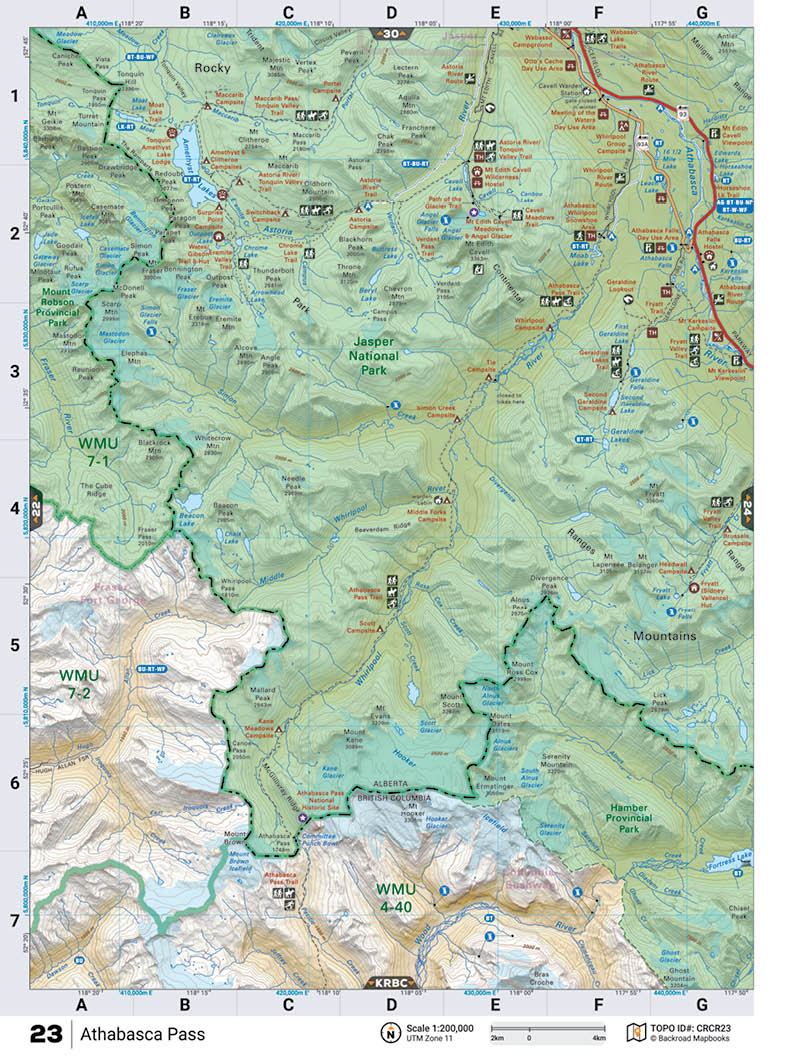 This recreation topographic map for Athabasca Pass highlights all the roads, fishing lakes & streams, front and backcountry campsites, paddling routes for canoeing and kayaking, wildlife viewing areas, multi-use trails for hiking, backcountry skiing, snowshoeing, mountain biking, horseback riding & more. Covering 1,950 km2 (753 mi2), this map measures 38 x 51 km (24 x 32 mi), providing you with more topographic and recreational detail for the Whiteswan Lake area than any other map on the market. Special features include private land and countless roads, trails and recreational Points of Interest. Included on this map are Athabasca Pass, Hamber Provincial Park, Jasper National Park, Mount Robson Provincial Park, Whirlpool River, Athabasca River, Amethyst Lakes, Fortress Lake and more!