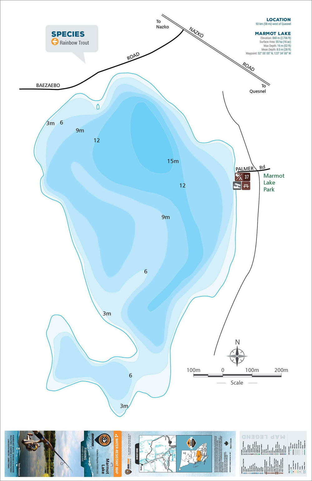This Fishing Chart covers Marmot Lake on Cariboo Region, BC. Resting in BC Fishing Region 5, the map features the lake bathymetry (or lake depths) and shore features including boat launches, campsites, fishing docks, parks and resorts. In addition to road or trail access points, the map also includes the lake location and information such as elevation, surface area, mean and maximum depth, and waypoint. Additional features include the fish species found in the lake, an area indicator or map key, scale bar and map legend.