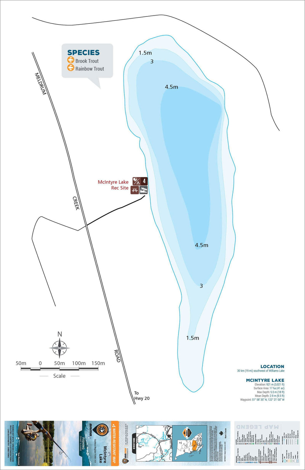 This Fishing Chart covers McIntyre Lake on Cariboo Region, BC. Resting in BC Fishing Region 5, the map features the lake bathymetry (or lake depths) and shore features including boat launches, campsites, fishing docks, parks and resorts. In addition to road or trail access points, the map also includes the lake location and information such as elevation, surface area, mean and maximum depth, and waypoint. Additional features include the fish species found in the lake, an area indicator or map key, scale bar and map legend.