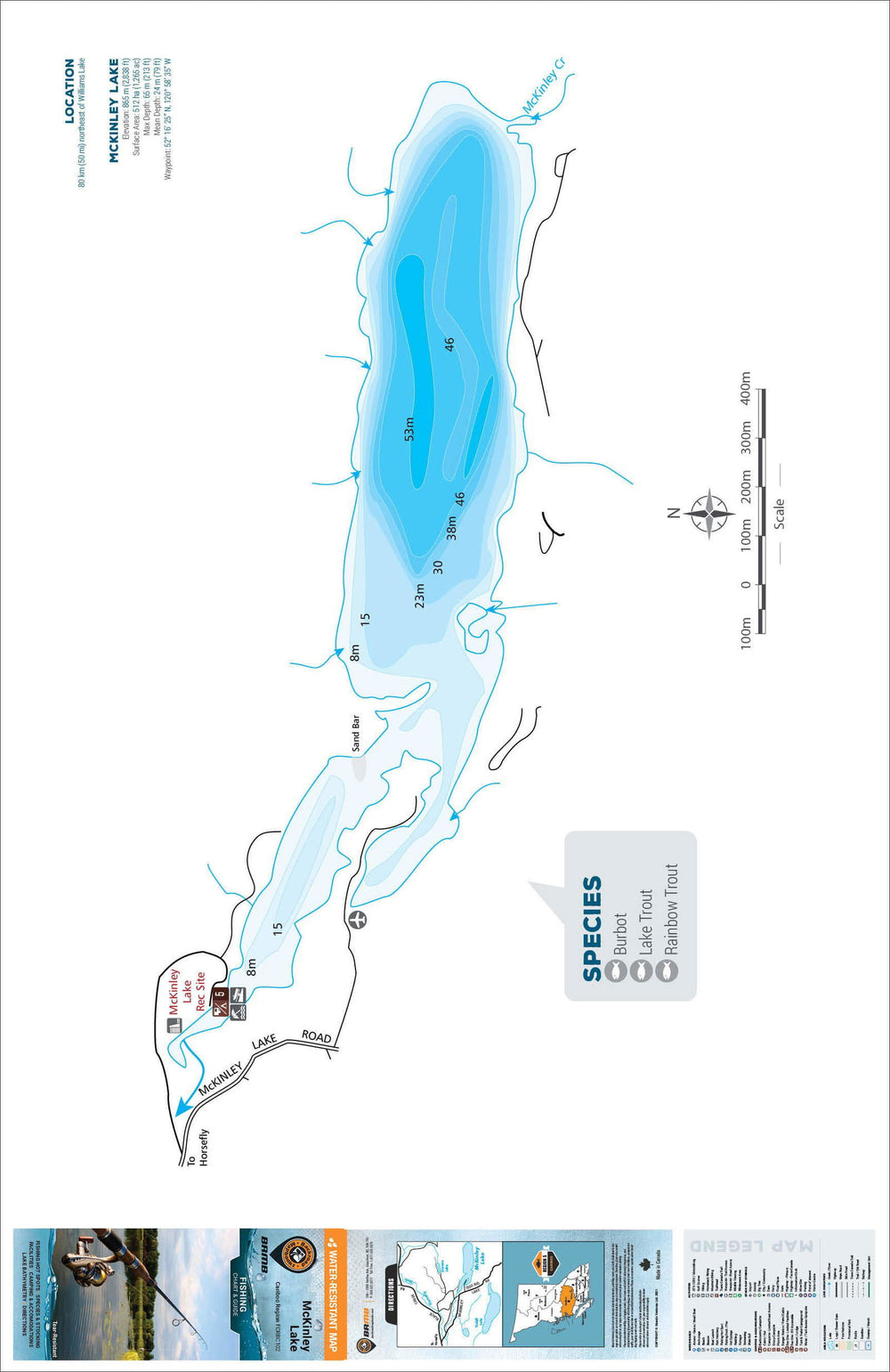 This Fishing Chart covers McKinley Lake on Cariboo Region, BC. Resting in BC Fishing Region 5, the map features the lake bathymetry (or lake depths) and shore features including boat launches, campsites, fishing docks, parks and resorts. In addition to road or trail access points, the map also includes the lake location and information such as elevation, surface area, mean and maximum depth, and waypoint. Additional features include the fish species found in the lake, an area indicator or map key, scale bar and map legend.