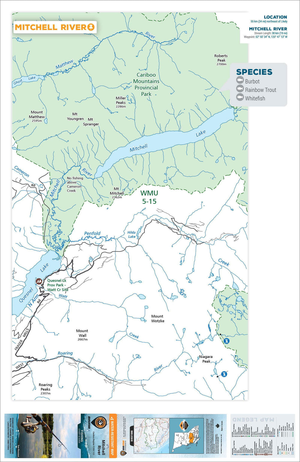 This Fishing Chart covers Mitchell River on Cariboo Region, BC. Resting in BC Fishing Region 5, the map features the lake bathymetry (or lake depths) and shore features including boat launches, campsites, fishing docks, parks and resorts. In addition to road or trail access points, the map also includes the lake location and information such as elevation, surface area, mean and maximum depth, and waypoint. Additional features include the fish species found in the lake, an area indicator or map key, scale bar and map legend.
