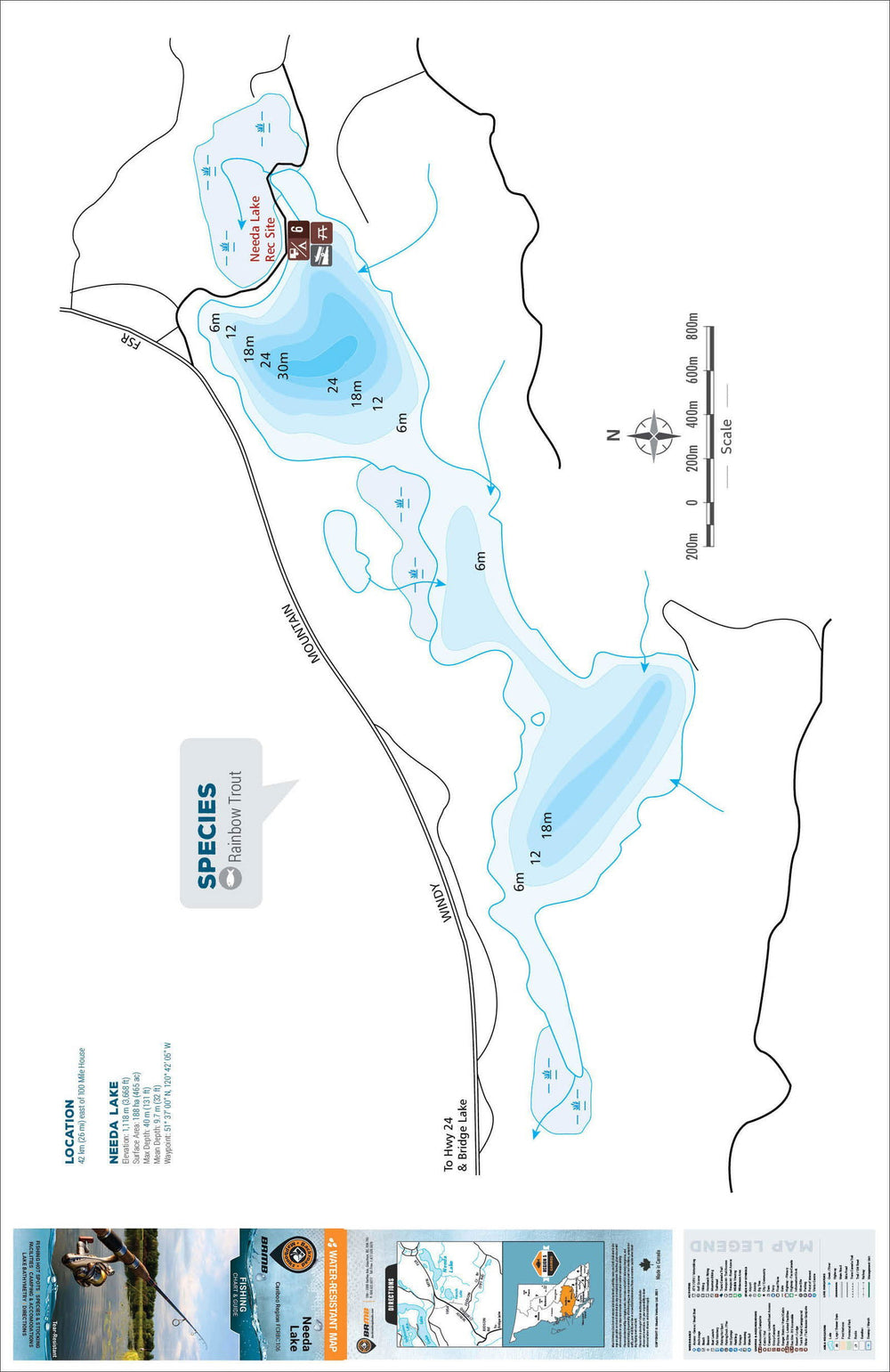 This Fishing Chart covers Needa Lake on Cariboo Region, BC. Resting in BC Fishing Region 5, the map features the lake bathymetry (or lake depths) and shore features including boat launches, campsites, fishing docks, parks and resorts. In addition to road or trail access points, the map also includes the lake location and information such as elevation, surface area, mean and maximum depth, and waypoint. Additional features include the fish species found in the lake, an area indicator or map key, scale bar and map legend.