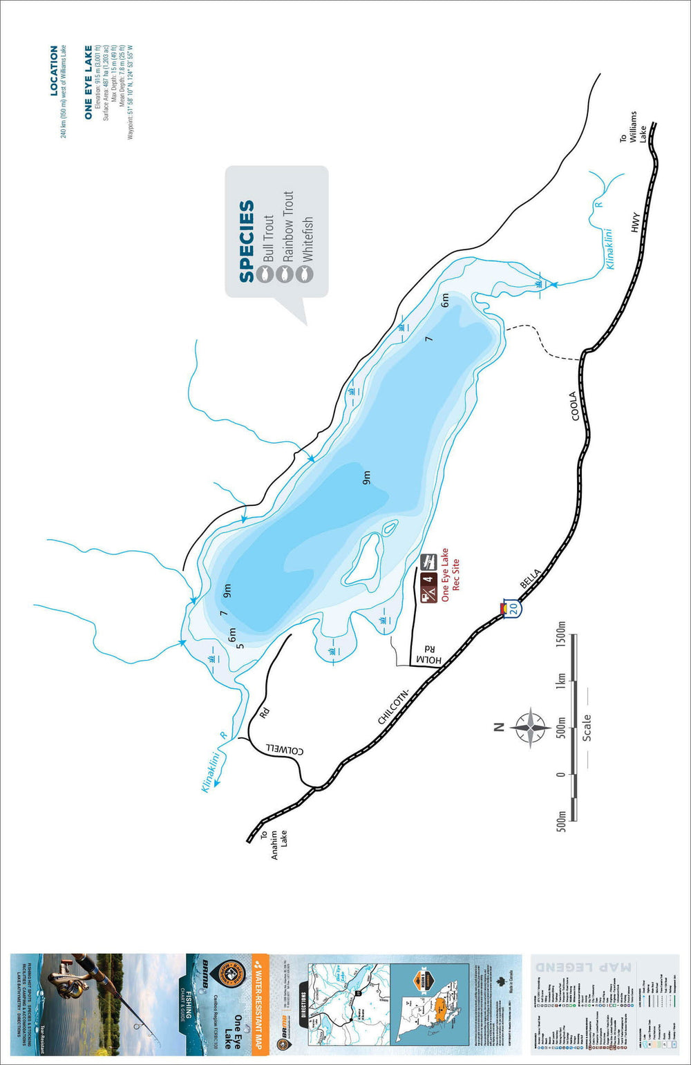 This Fishing Chart covers One Eye Lake on Cariboo Region, BC. Resting in BC Fishing Region 5, the map features the lake bathymetry (or lake depths) and shore features including boat launches, campsites, fishing docks, parks and resorts. In addition to road or trail access points, the map also includes the lake location and information such as elevation, surface area, mean and maximum depth, and waypoint. Additional features include the fish species found in the lake, an area indicator or map key, scale bar and map legend.