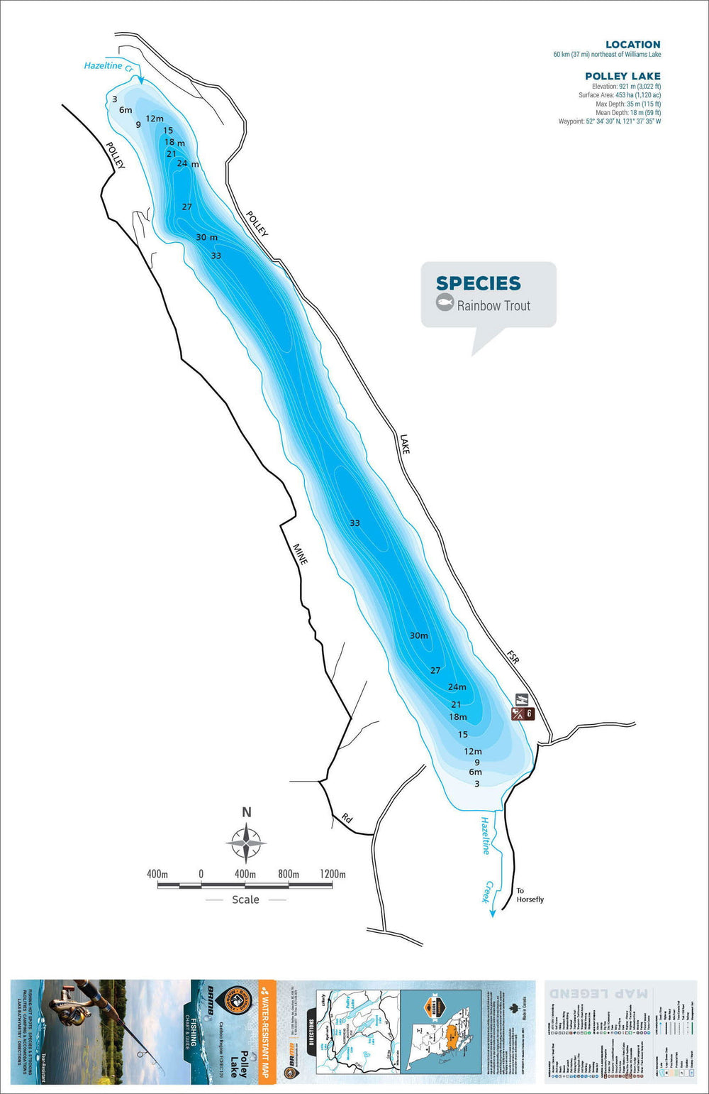 This Fishing Chart covers Polley on Cariboo Region, BC. Resting in BC Fishing Region 5, the map features the lake bathymetry (or lake depths) and shore features including boat launches, campsites, fishing docks, parks and resorts. In addition to road or trail access points, the map also includes the lake location and information such as elevation, surface area, mean and maximum depth, and waypoint. Additional features include the fish species found in the lake, an area indicator or map key, scale bar and map legend.
