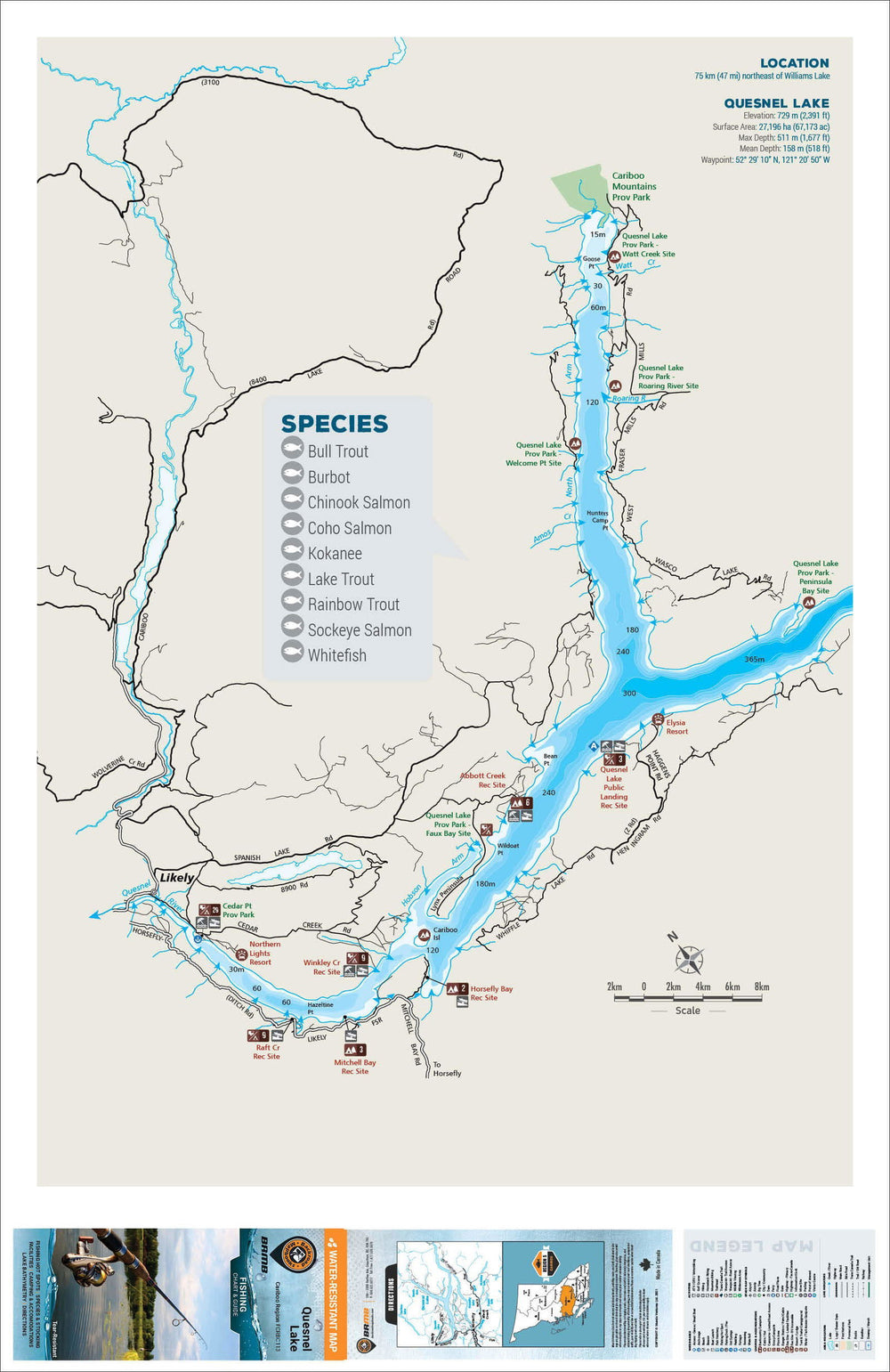This Fishing Chart covers Quesnel Lake on Cariboo Region, BC. Resting in BC Fishing Region 5, the map features the lake bathymetry (or lake depths) and shore features including boat launches, campsites, fishing docks, parks and resorts. In addition to road or trail access points, the map also includes the lake location and information such as elevation, surface area, mean and maximum depth, and waypoint. Additional features include the fish species found in the lake, an area indicator or map key, scale bar and map legend.
