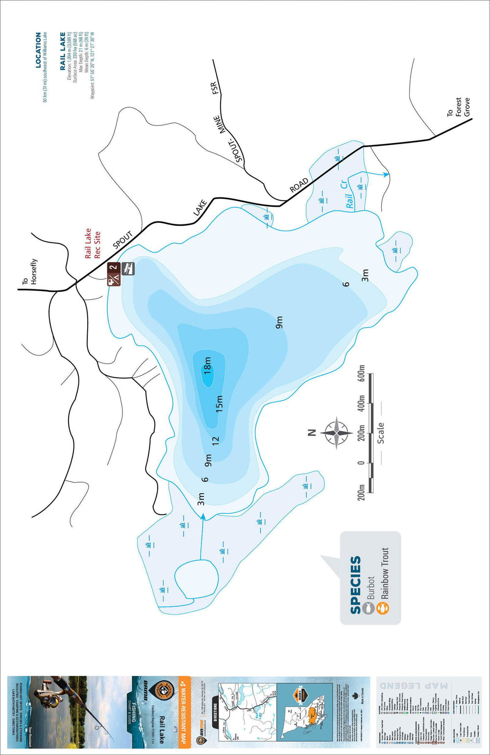 This Fishing Chart covers Rail Lake on Cariboo Region, BC. Resting in BC Fishing Region 5, the map features the lake bathymetry (or lake depths) and shore features including boat launches, campsites, fishing docks, parks and resorts. In addition to road or trail access points, the map also includes the lake location and information such as elevation, surface area, mean and maximum depth, and waypoint. Additional features include the fish species found in the lake, an area indicator or map key, scale bar and map legend.