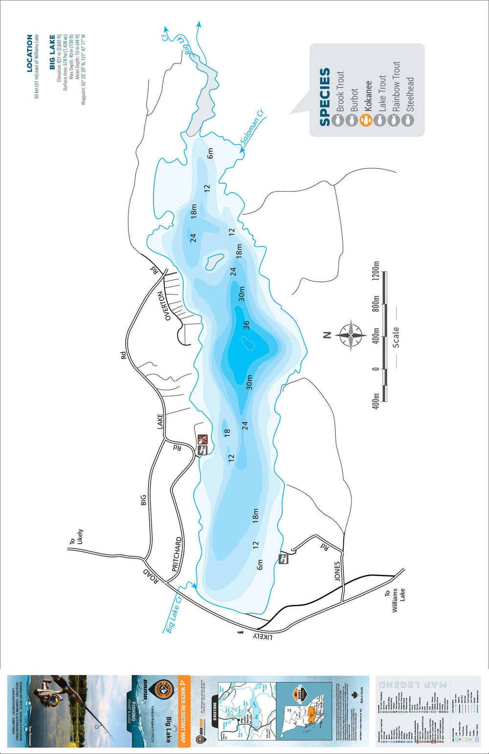 This Fishing Chart covers Big Lake - Williams Lk Area on Cariboo Region, BC. Resting in BC Fishing Region 5, the map features the lake bathymetry (or lake depths) and shore features including boat launches, campsites, fishing docks, parks and resorts. In addition to road or trail access points, the map also includes the lake location and information such as elevation, surface area, mean and maximum depth, and waypoint. Additional features include the fish species found in the lake, an area indicator or map key, scale bar and map legend.