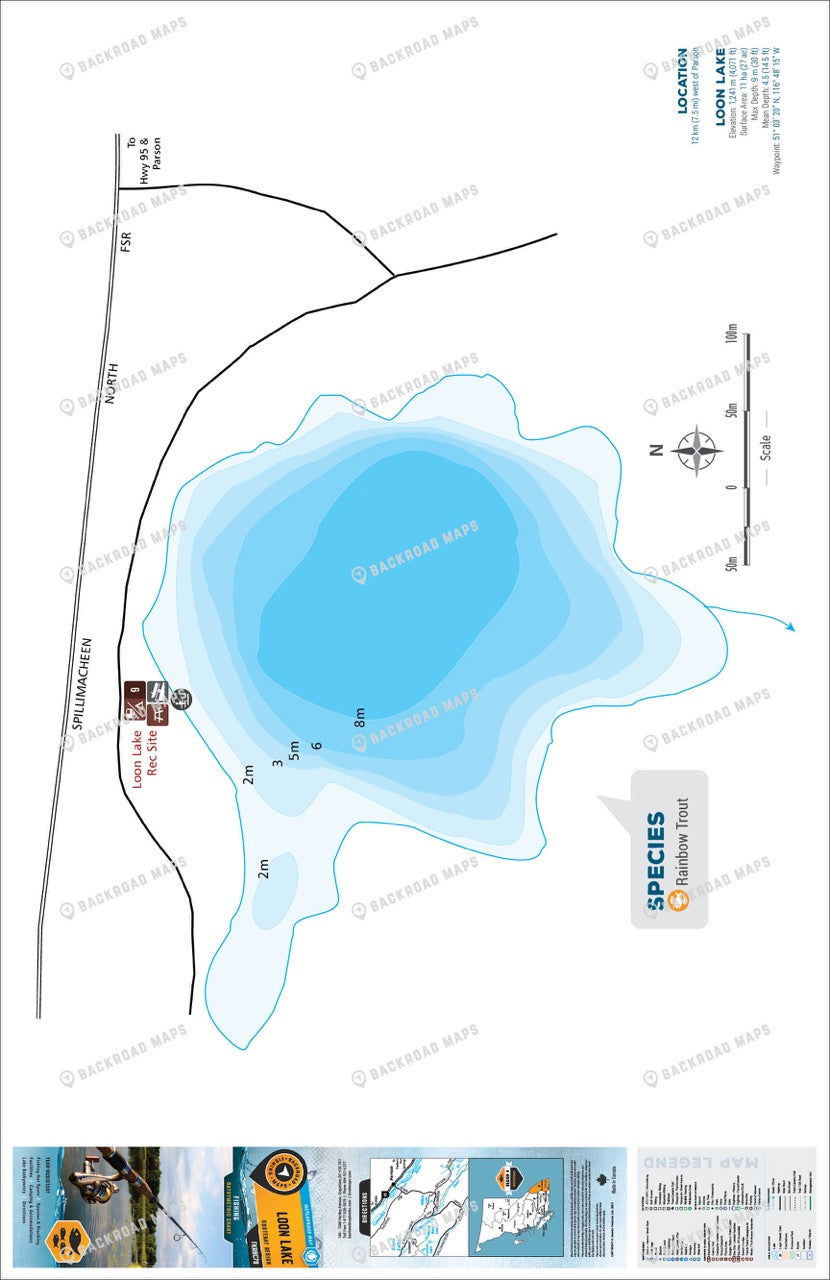 This Fishing Chart covers Loon Lake - Golden on Kootenay Rockies, BC. Resting in BC Fishing Region 4, the map features the lake bathymetry (or lake depths) and shore features including boat launches, campsites, fishing docks, parks and resorts. In addition to road or trail access points, the map also includes the lake location and information such as elevation, surface area, mean and maximum depth, and waypoint. Additional features include the fish species found in the lake, an area indicator or map key, scale bar and map legend.