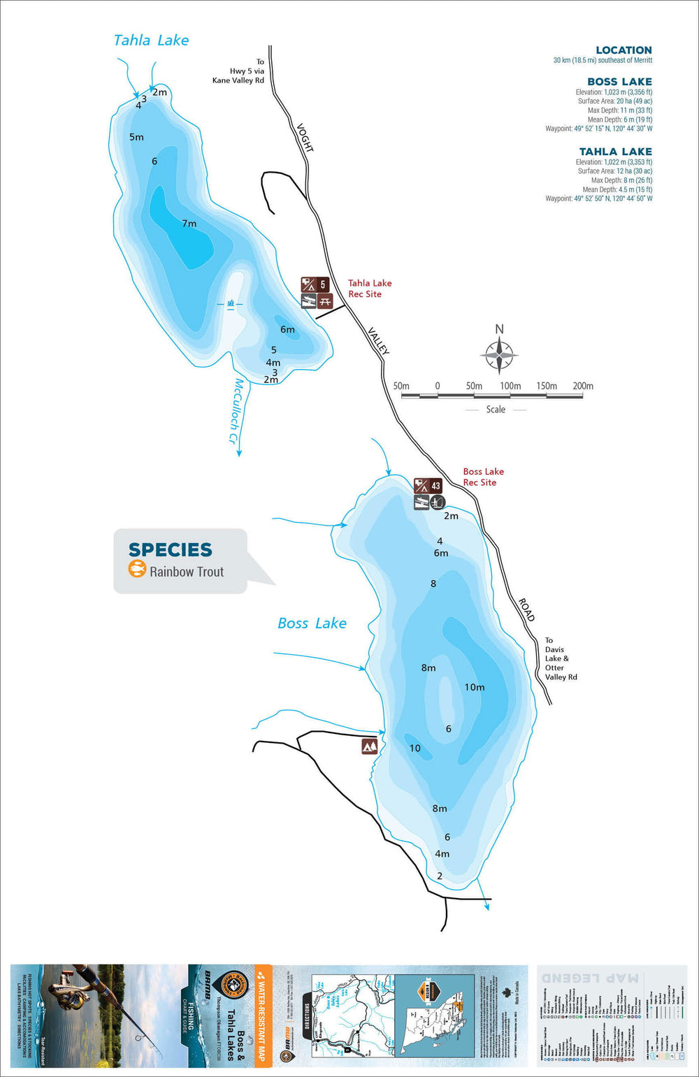 This Fishing Chart covers Boss & Tahla Lakes on Thompson Okanagan, BC. Resting in BC Fishing Region 8, the map features the lake bathymetry (or lake depths) and shore features including boat launches, campsites, fishing docks, parks and resorts. In addition to road or trail access points, the map also includes the lake location and information such as elevation, surface area, mean and maximum depth, and waypoint. Additional features include the fish species found in the lake, an area indicator or map key, scale bar and map legend.