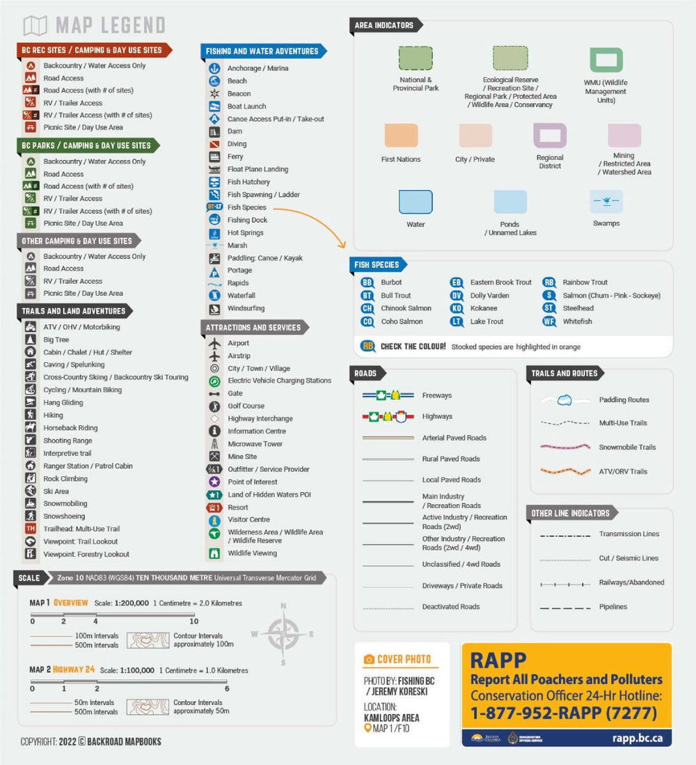- Easy to read, large-scale 86 x 117 cm (34 x 46.25 inch) maps covering the larger Land of Hidden Waters area along with a detailed map of the BC Fishing Highway 24 corridor, derived from our Backroad Mapbooks at a scale of 1:100,000 and 1:200,000