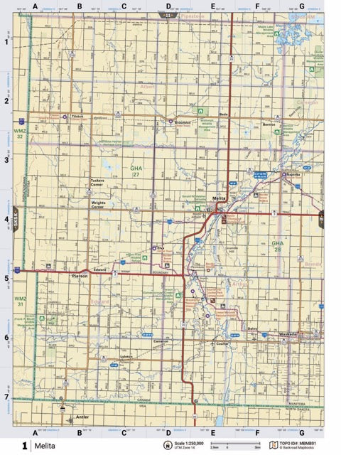 This recreation topographic map for Melita highlights all the logging/resource roads, hunting areas, fishing lakes & streams, campsites, paddling routes for canoeing and kayaking, wildlife viewing areas, multi-use trails for hiking, biking, horseback riding, cross-country skiing and snowshoeing, motorized trails for ATVing and snowmobiling & more. Covering 3,040 km2 (1,175 mi2), this 1:85,000 scale map measures 50 x 63.5 km (30 x 39.5 mi), providing you with more topographic and recreational detail for the Melita area than any other map on the market. New features include Crown land areas and labeled fish species, plus countless new trails, roads and recreational Points of Interest. Included in this map are Bede, Broomhill, Cameron, Coulter, Dainy, Elva, Lyleton, Melita, Napinka, Pierson, Tucker's Corner, Wrights Corner and Waskida, plus the Broomhill Wildlife Management Area, Hunters Lake, Lauder Sandhills Wildlife Management Area, Pierson Creek Wildlife Management Area and the Souris River.